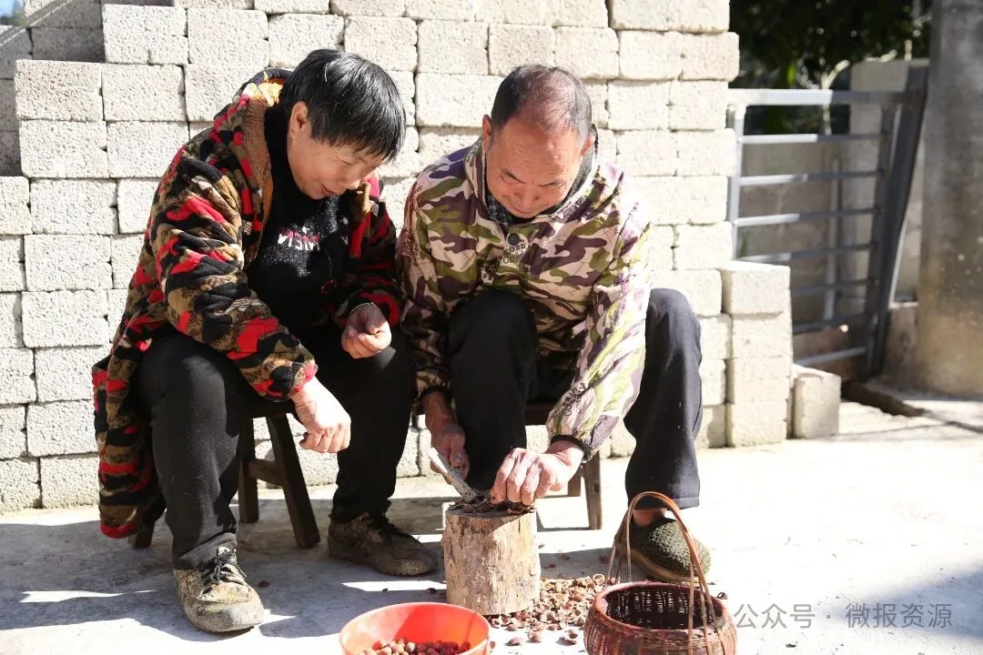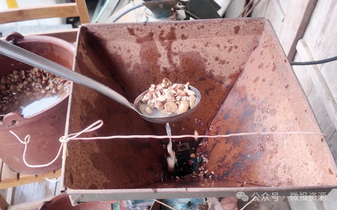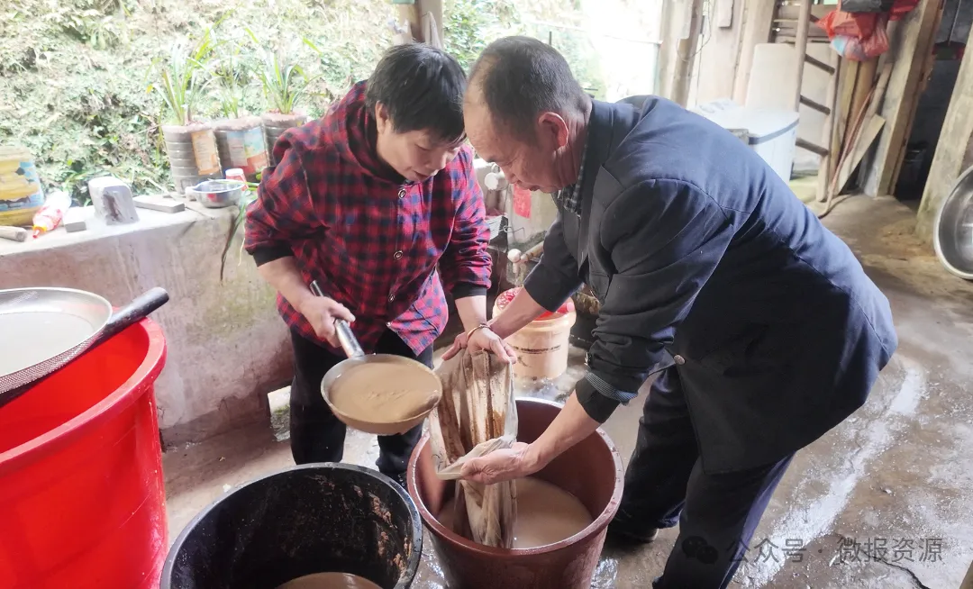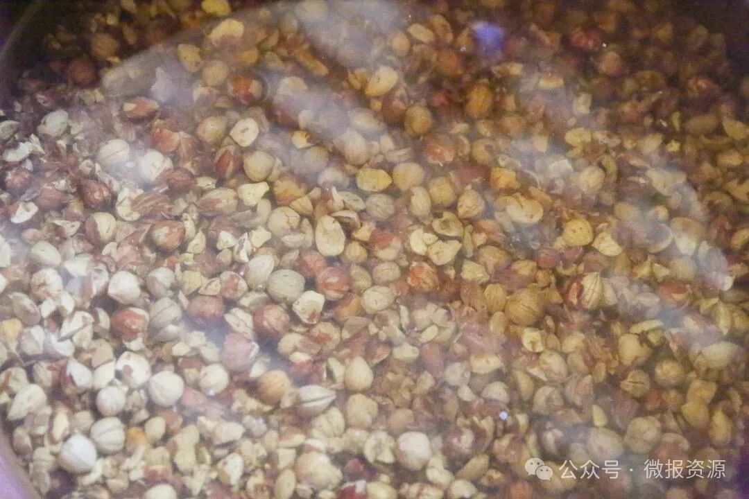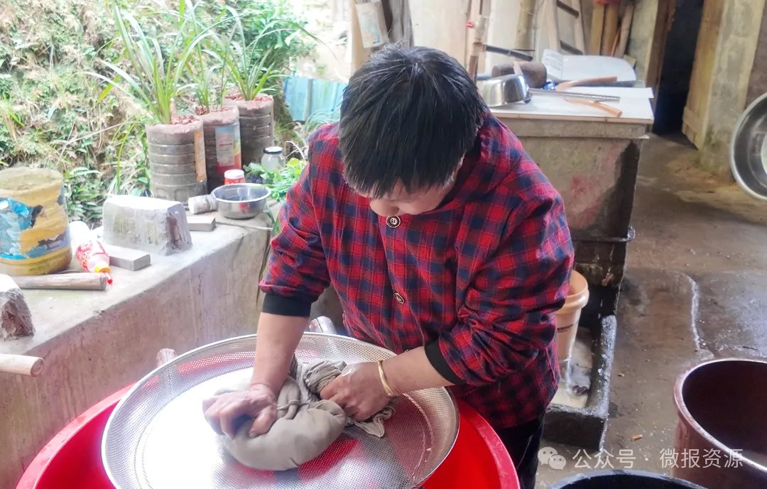 每一块橡子豆腐的诞生,都是一场与时间的温柔对话,藏着村民刻在骨子里的耐心与匠心。晴好的日子里,村民挎着竹篮上山,精心采摘成熟的橡子。采收归来的鲜果,被均匀摊在院坝里晾晒,阳光慢慢抽走水分,让橡子变得紧实干燥;随后经碾压破碎,再手工细细剔除坚硬外壳,金黄的橡子仁在指尖流转,便完成了食材的初次蜕变。