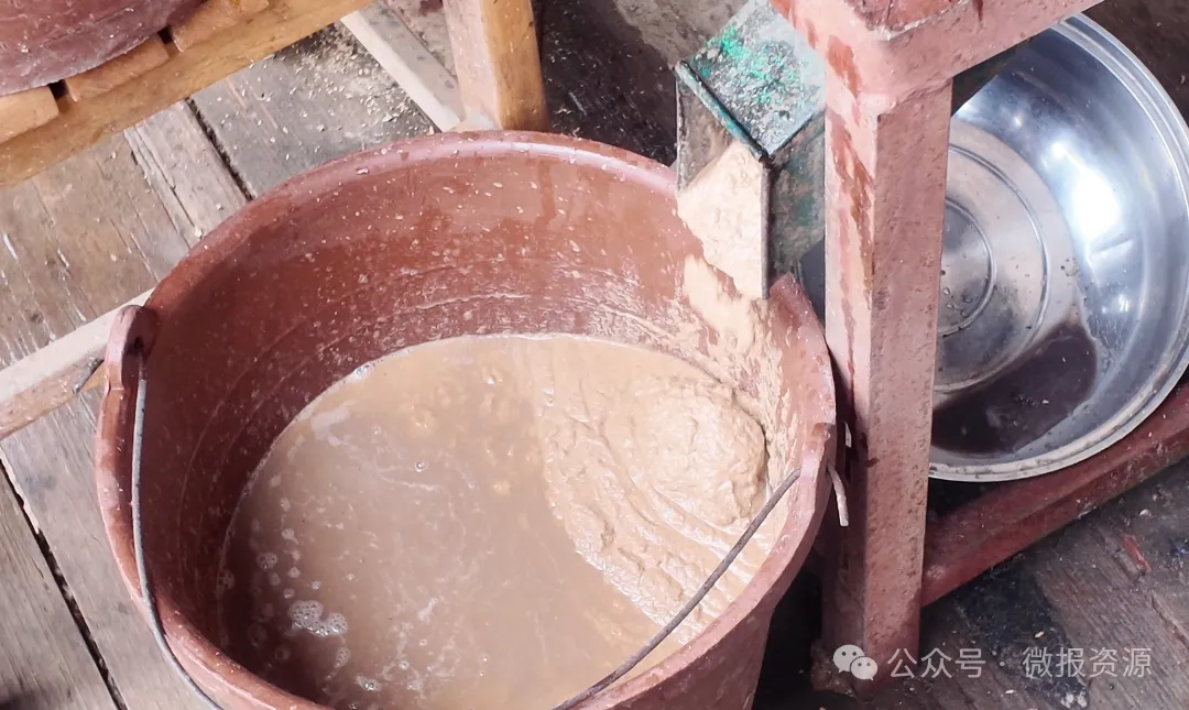 脱涩,是橡子蜕变为美味的关键,也是最考验心性的工序。去壳后的橡子仁浸入清水中,需静泡7至10天,期间每日定时换水,从不间断。清澈的水流一遍遍冲刷,慢慢析出单宁等苦涩物质,山野的生涩渐渐褪去,只留下橡子独有的清润香气。浸泡完成后,村民们将泡软的橡子仁连水一同研磨,再用细筛与纱布反复过滤,滤去粗渣,让浆液静置沉淀。随后,将沉淀后的浆液多次漂洗、脱色,直接入锅慢火熬煮,火候的把控全凭经验,待浆液变得黏稠绵密,倒入容器静置冷却。