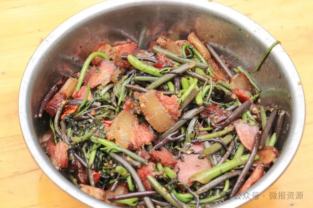 采摘归来,灶台旁早已备好农家自制的腊肉。腊肉历经冬日熏制,油脂晶莹透亮,咸香风味醇厚,是山里人家款待宾客的底气所在。在热锅中放入腊肉进行煸炒,直至出油发亮,接着加入蒜末、干辣椒爆香,再依次将蕨菜与椿芽放入锅中,用旺火快速翻炒。腊肉的烟熏风味与山野菜的清新香气相互交织融合,蕨菜口感滑嫩,椿芽味道鲜香,一筷子夹入口中,仿佛整个春天都含在了舌尖之上。