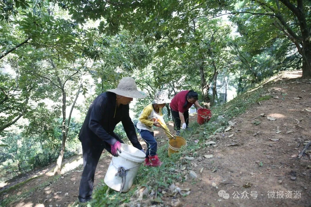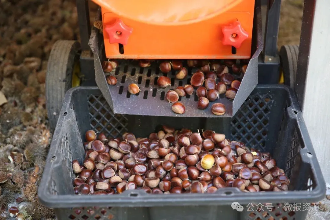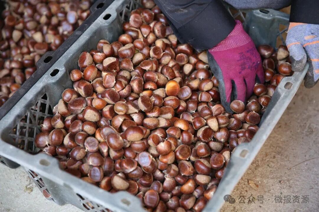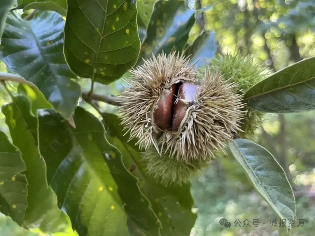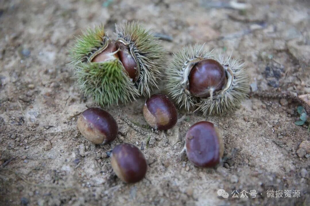 走进林中,只见成熟的板栗大多已经撑破了“刺衣”,不时露出一张张“笑脸”。有的还带着刺壳散落在林间空地上。栗农们不停地穿梭在林下,弯腰拾捡散落的板栗,用指尖轻轻拨开“刺衣”放进袋中。游客们则手持竹竿,轻轻敲打树枝,顿时响起板栗噼里啪啦落地的声音。大人孩子纷纷弯腰捡拾,林间洋溢着欢声笑语。