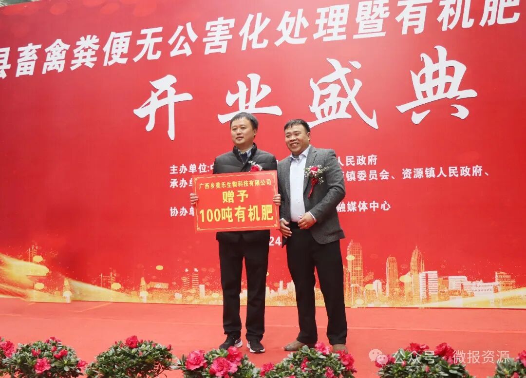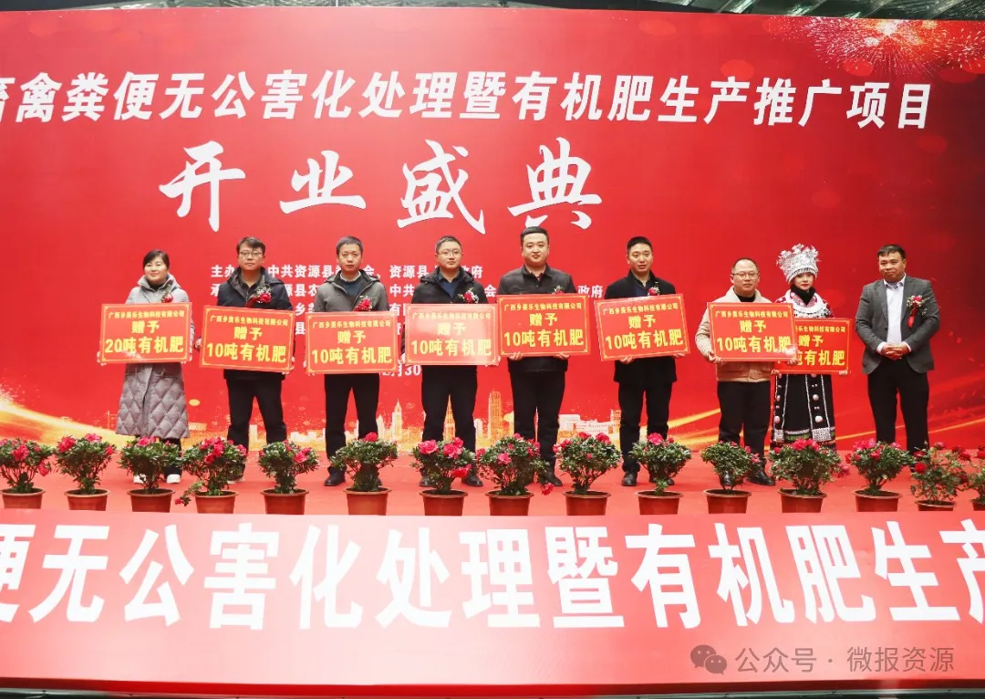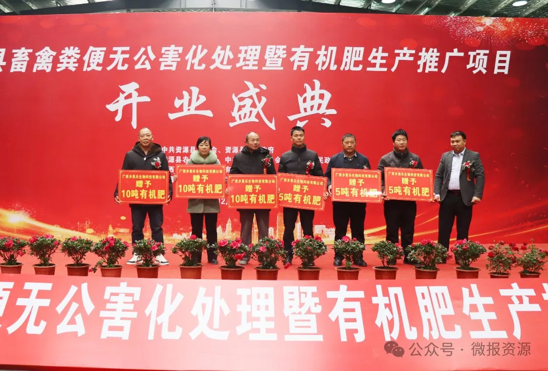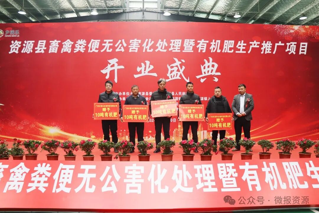 12月30日,资源县广西乡美乐生物科技有限公司畜禽粪便无公害化处理暨有机肥生产推广项目竣工投产仪式在资源县金山村闫家屯干冲头(资龙公路金山山庄路口左行约300米)举行。
