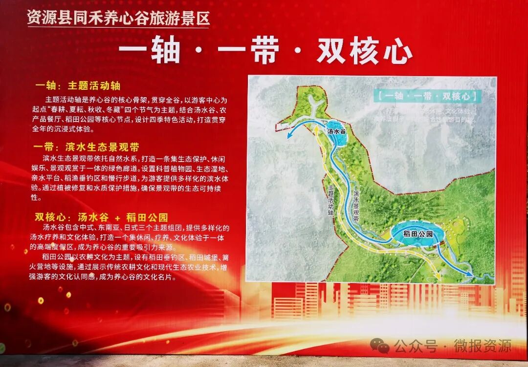 据悉,3个开竣工项目总投资9600万元,其中,资源县同禾养心谷景区建设项目以养心谷的核心骨架为主题活动轴,结合“春耕、夏耘、秋收、冬藏”四个节气主题,设计四季特色活动,打造贯穿全年的沉浸式体验;以滨水生态景观为带,依托自然水系,打造一条集生态保护、休闲娱乐、景观观赏于一体的绿色廊道;以温泉谷和稻田公园为双核心,提供多样化的温泉疗养和文化体验,建设以农耕文化为主题的稻田公园。