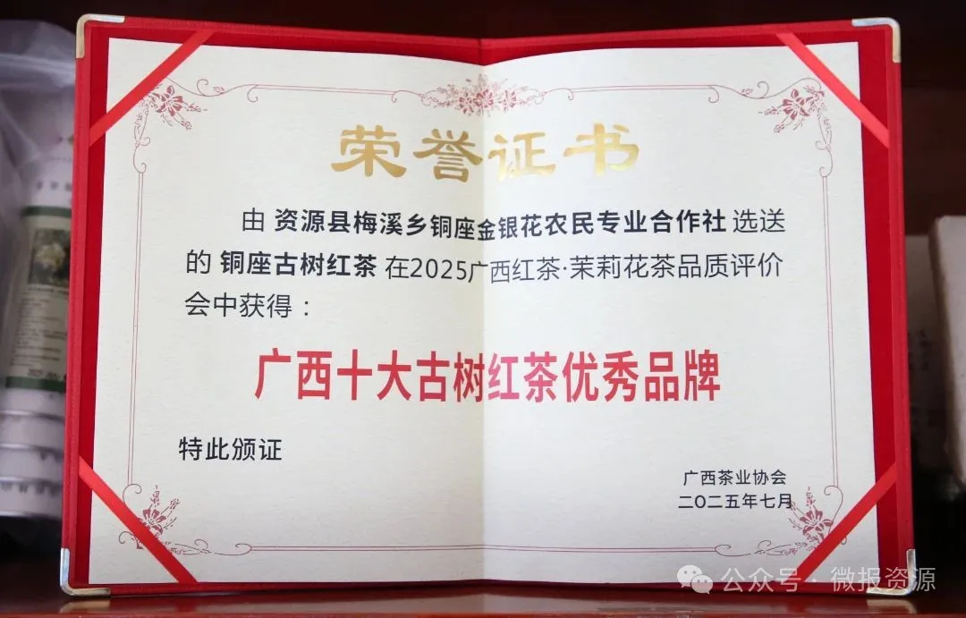 近日,在2025广西红茶·茉莉花茶品质评价会上,资源县铜座古树红茶凭借卓越品质从全区众多参评茶样中脱颖而出,成功斩获“广西十大古树红茶优秀品牌”称号,同时入选广西茶叶五星级品质评价报告榜单,成为桂林市仅8家获此殊荣的茶企之一。