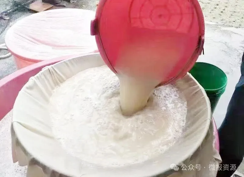 早上天刚放晴,唐桂福和家人将新挖掘的红薯倒入山泉水中刷洗,红褐色的薯皮被褪下,露出或是金黄饱满,或是紫白相间的薯肉。“我们苗乡社水村的高山红薯,日照充足、糖分饱满,全程不施农药,做出的粉丝才格外爽滑透亮、清香甘甜。”唐桂福一边介绍一边用竹片将红薯上的污泥刮去,再用刷子一遍遍擦拭红薯的每一寸皮肤。“这个步骤尤为关键,但凡没清洗到位,沉淀出来的淀粉就不够白。”随后将清洗好的红薯进行磨粉,乳白色的薯浆缓缓流出,预示着一段美味旅程的开启。