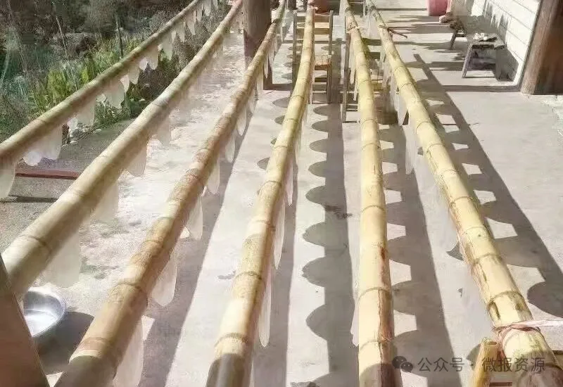 过滤是最考验耐心的环节。薯浆被盛入特制的纱布袋中,经过反复揉压,富含淀粉的浆液渗入缸中,如此反复数次,方能将薯渣彻底分离。随后便是长达两日的沉淀期,其间需不断换水、搅拌,缸底才会凝结出厚厚一层洁白如雪、细腻如脂的红薯淀粉。最见功夫的当数“烫皮”工序,将淀粉与山泉水经过一定比例混合搅拌,倒入特制的铁盆里,再将铁盆置于沸水之上缓缓转动、摇匀,铁盆底部便凝结成了一片透明的薄膜。“力道要匀,速度要稳,火候要准,这手艺我们足足练了三十年。”心灵手巧的农家妇女们,小心翼翼地将薄膜撕下,轻轻晾晒在早已洗净的竹竿上。
