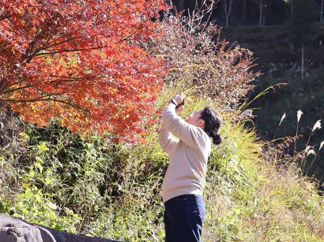 石山底屯藏于越城岭腹地,独特的山地气候与肥厚土壤,孕育出这片藏于深山的红枫秘境。当秋意漫过林梢,寒霜轻吻叶片,红枫便悄然开启了一场色彩的蜕变——从梢头的浅绯开始,一寸寸晕染至叶根的深红,其间还缀着绯红、紫红的过渡,像是大自然以秋为笔,蘸着霞光在山野间肆意挥洒。整座山岗便似燃着的烈焰,又似铺展的丹霞,错落的枫林与远处黛色山峦相映,晕开层次分明的秋景。清晨,深秋的薄雾如轻纱般缠绕林间,红枫在朦胧中显露出隐约的红韵,阳光穿透雾霭洒下时,叶片上的露珠折射出细碎的金光,恍若仙境;正午,秋阳正好,红枫褪去朦胧,以最炽烈的姿态舒展,叶脉的纹理在阳光下清晰可见,红得坦荡而奔放;傍晚,深秋的暮色为枫林镀上一层暖橙,枫叶与天边晚霞交相辉映,连飘落的叶片都带着醉人的红,轻吻着脚下的土地。“原以为画中红枫已是极致,不料此间实景,竟比丹青更添三分灵动。”来自远方的摄影人举着相机,从日出守到日落,只为定格这秋枫的瞬息之美。
