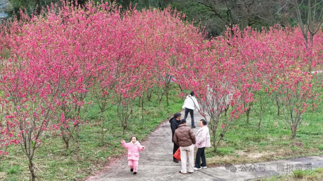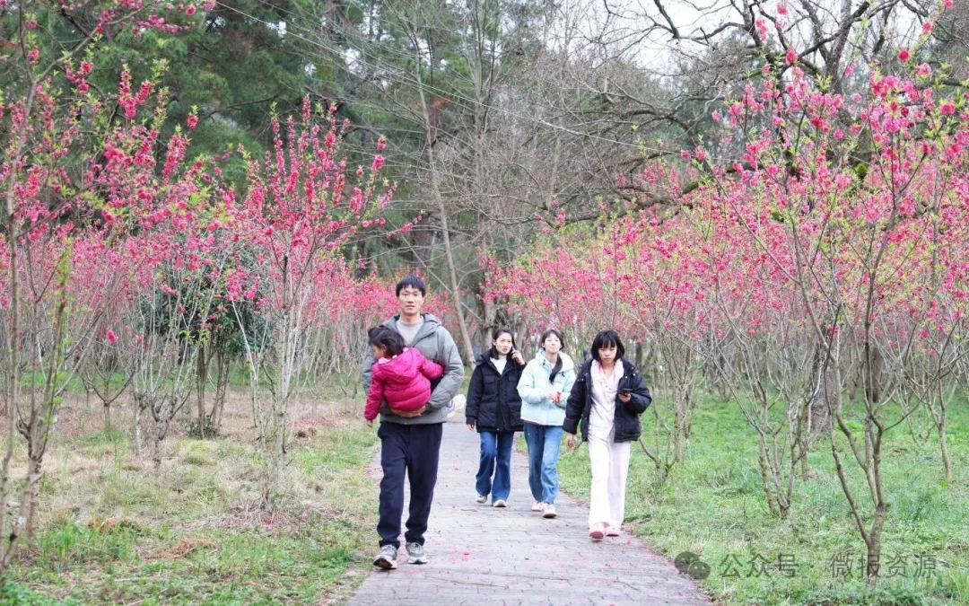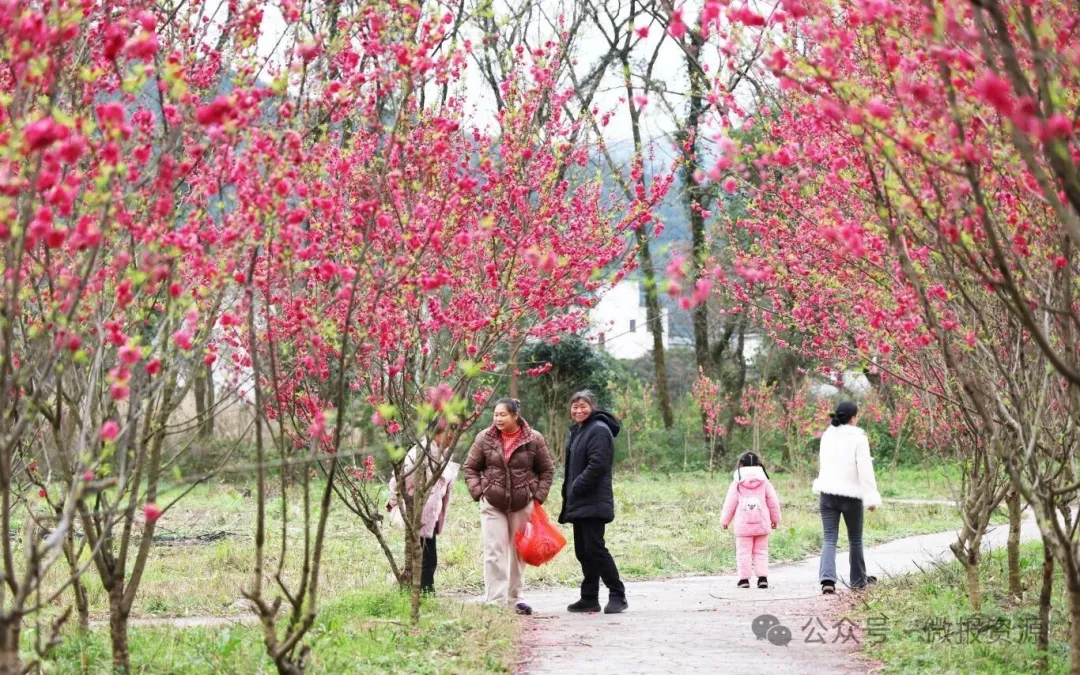 步入抱财丘桃林,灼灼桃花为古村注入浓浓生机,粉嫩的桃花缀满枝头,或含苞待放,或肆意舒展,微风拂过,花香沁人心脾。花间小径、村口廊亭、江畔步道处处皆是景致,游客们漫步其中,驻足拍照、闲谈赏景,尽享春日惬意。村民们闲暇时赏花闲谈,沉浸式感受桂北乡村的宁静与美好,人与自然和谐共生的画面,成为春日里最动人的风景。