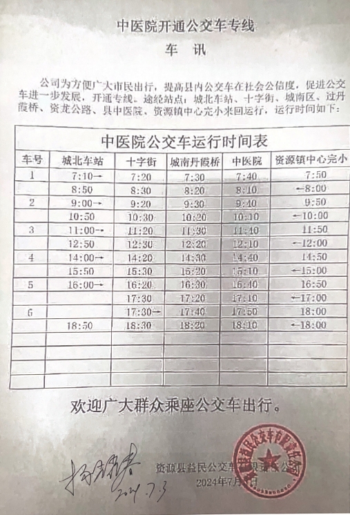 中医院开通公交车专线时刻表
