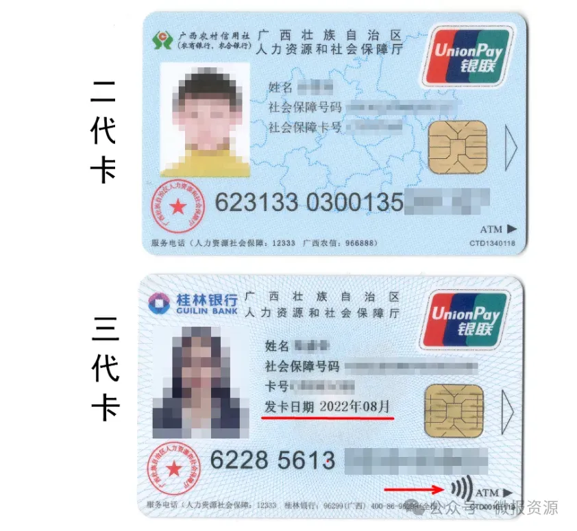 第三代社保卡:正面背景为白色,背景为淡蓝色网格线,中部有防伪折光水印,最明显区别标志为新增“发卡日期”信息和右下角的非接触读卡标识。