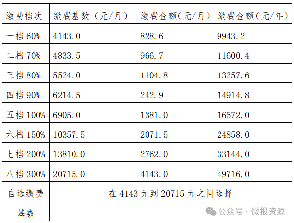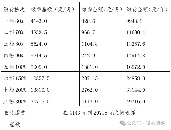 根据桂人社发〔2025〕42号文件精神,2025年度参加城镇职工基本养老保险的灵活就业人员可在城镇职工基本养老保险缴费基数的下限4143元/月至上限20715元/月之间,自主选择缴费基数进行缴费。缴费档次如图所示。