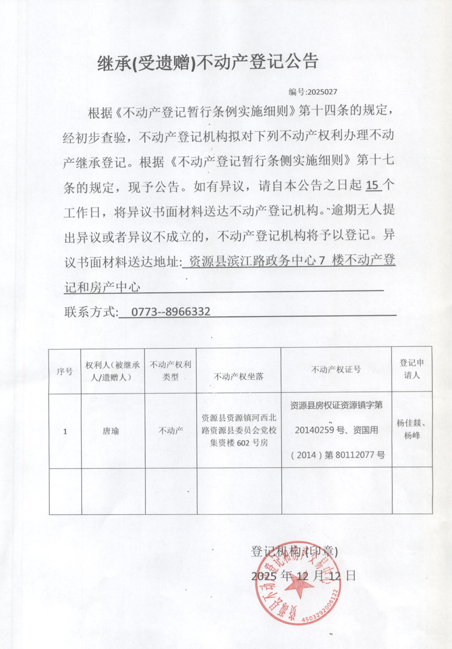2025-12-12 15:49 来源:不动产登记和房产交易中心 作者:资源县自然资源局