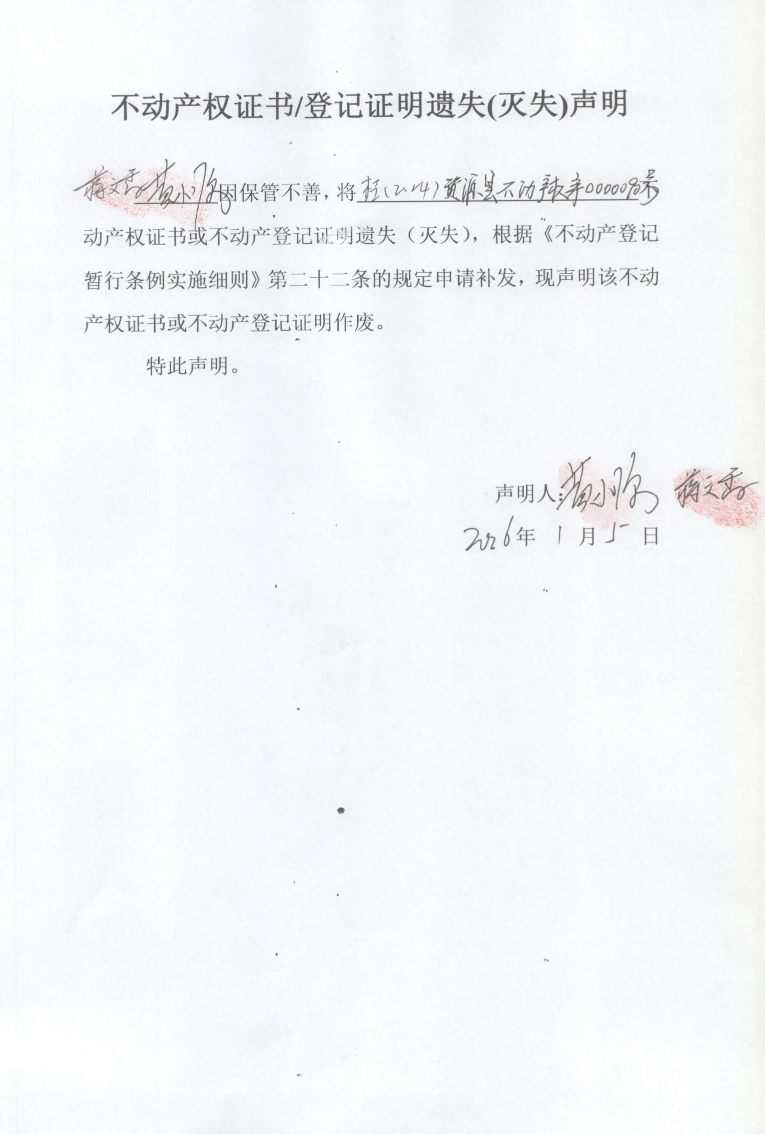 关于蒋文秀、黄小源不动产权证书或登记证明遗失(灭失)声明