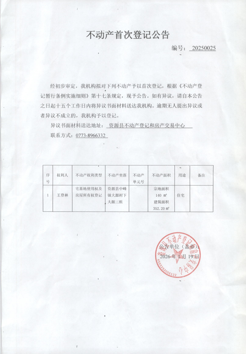 关于王登林不动产首次登记公告