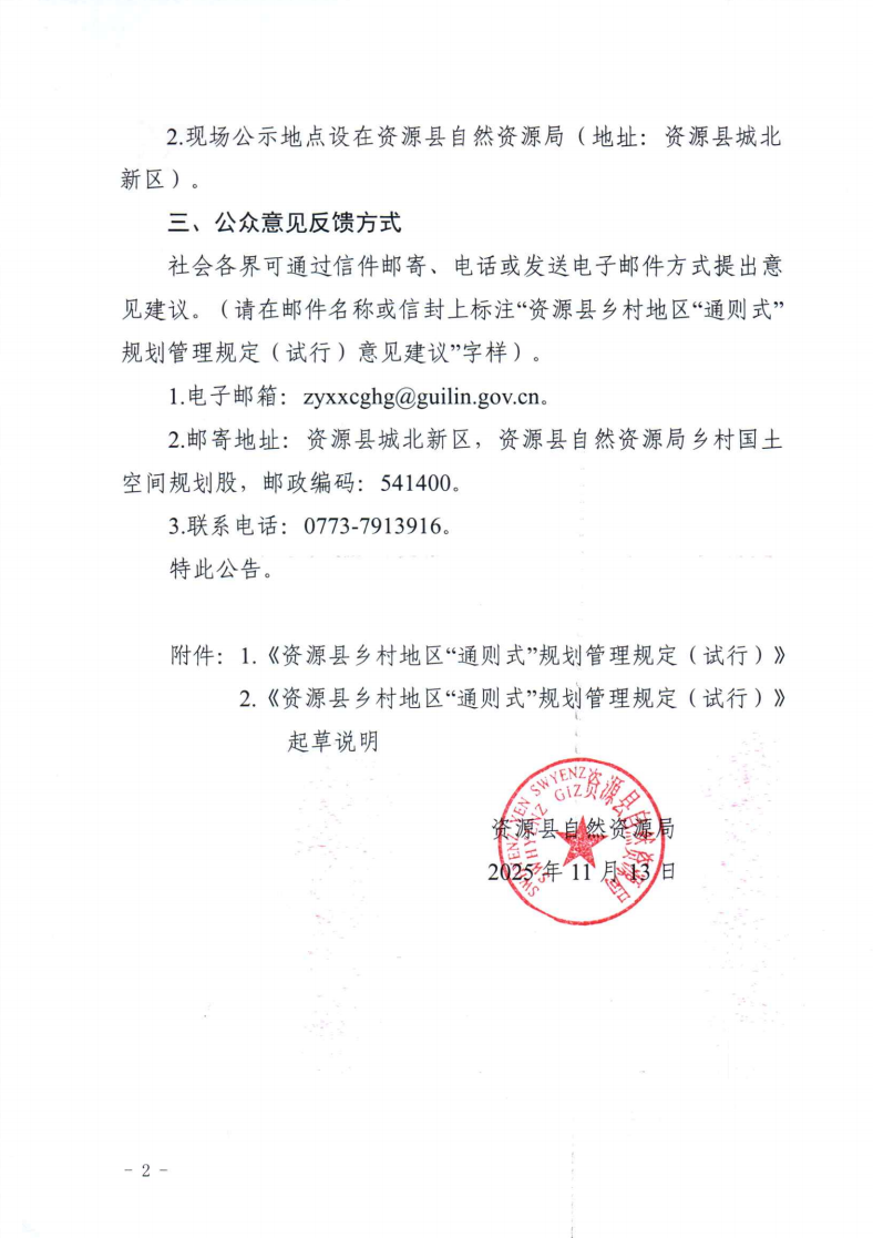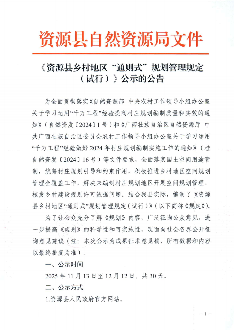 《资源县乡村地区“通则式”规划管理规定(试行)》公示的公告