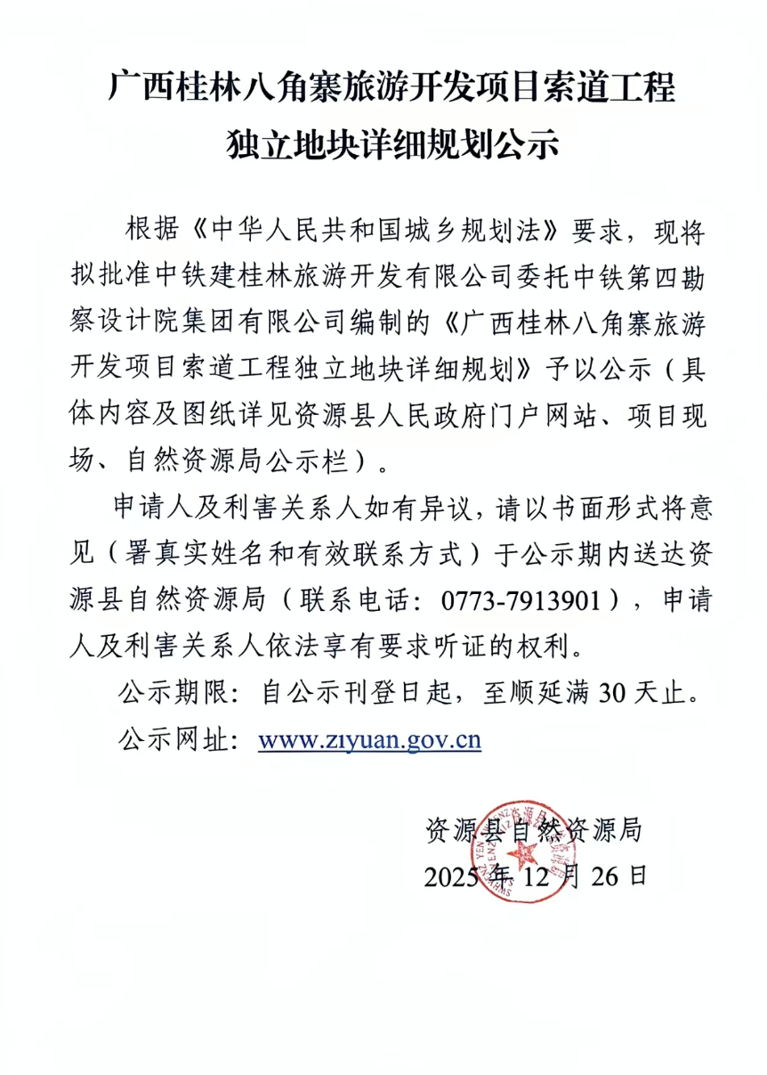 广西桂林八角寨旅游开发项目索道工程独立地块详细规划公示