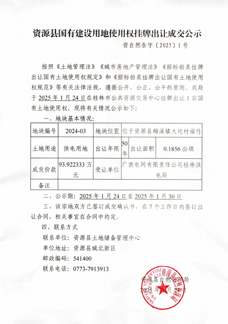 资源县国有建设用地使用权挂牌出让成交公示