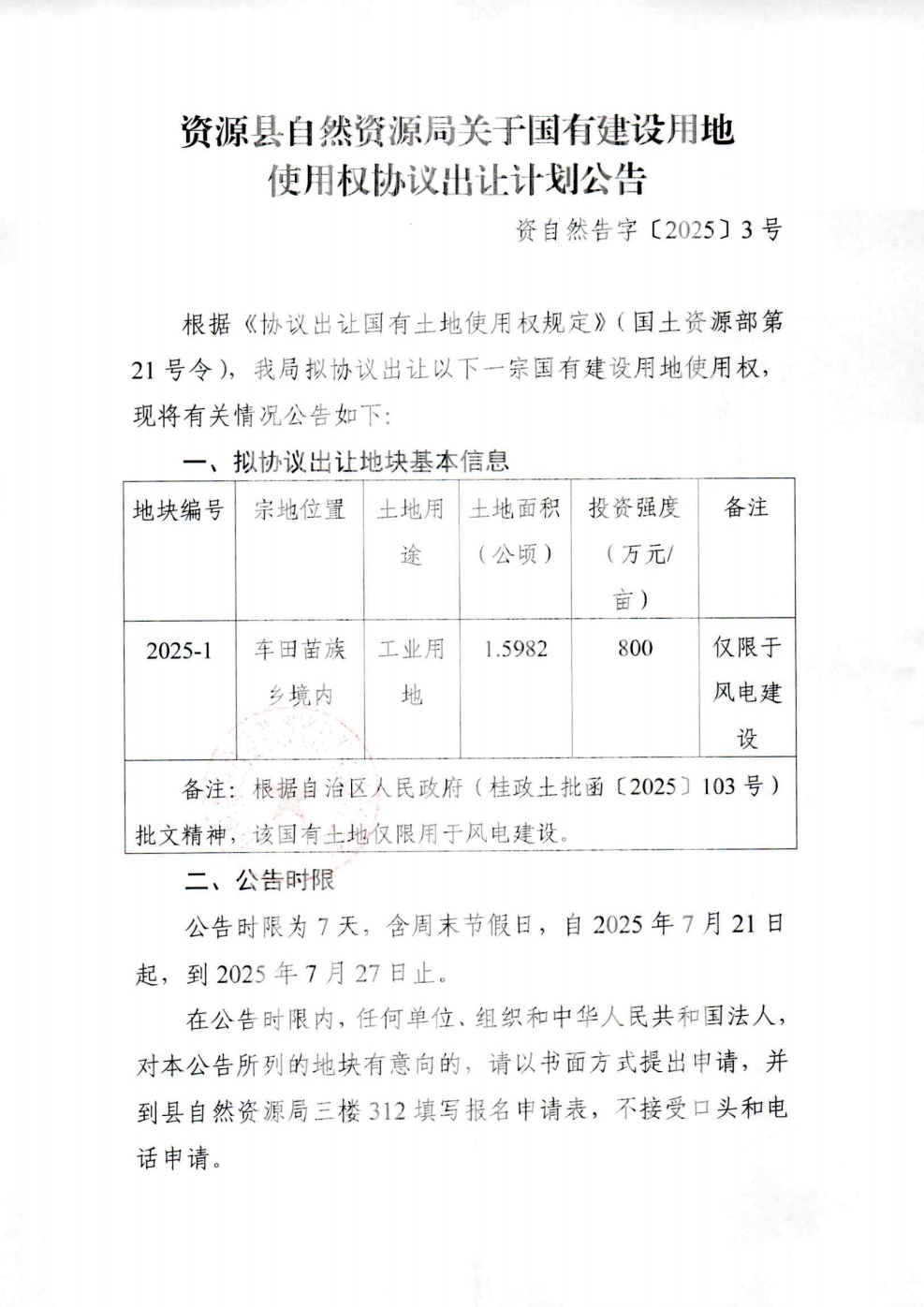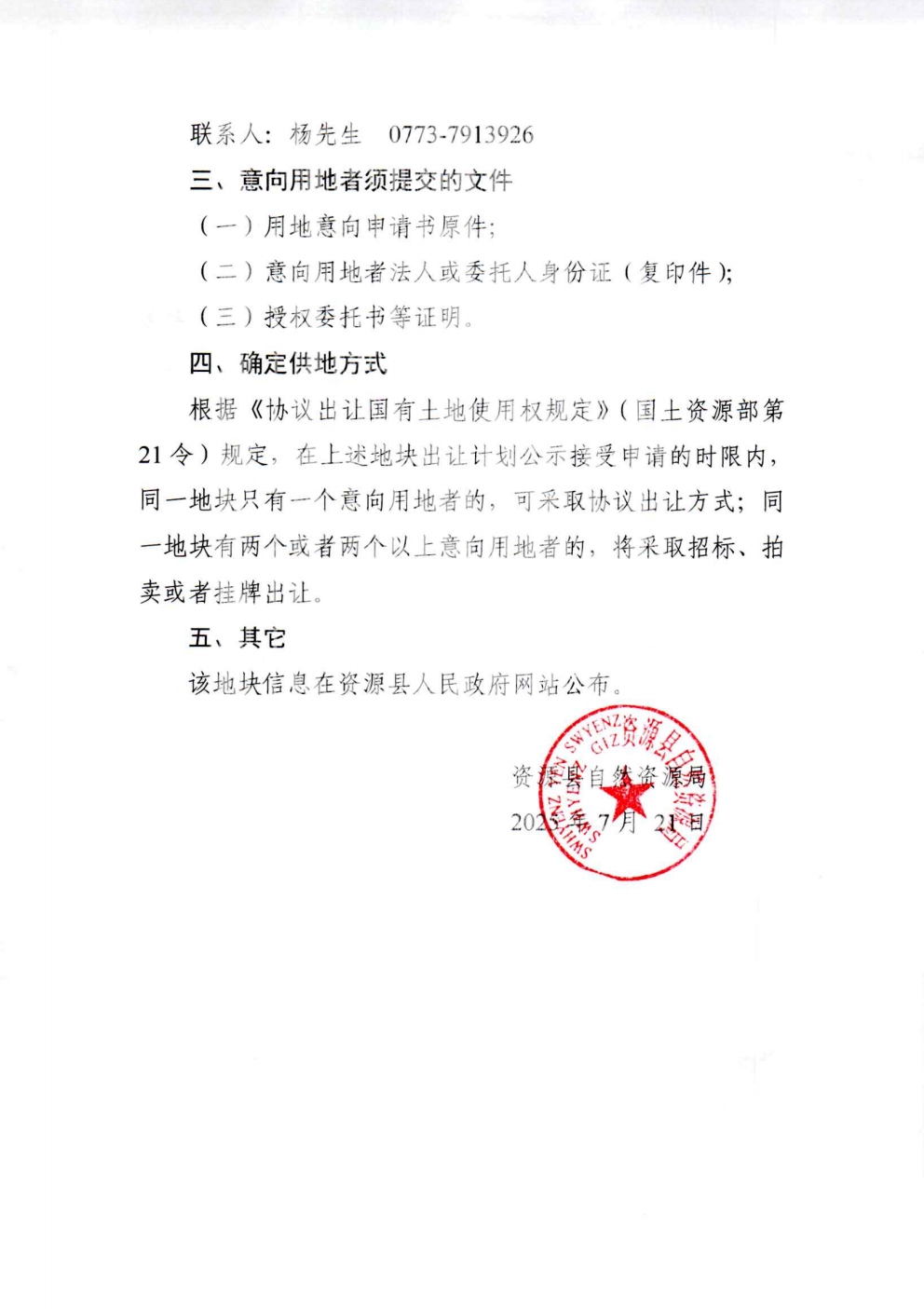 资源县自然资源局关于国有建设用地使用权协议出让计划公告
