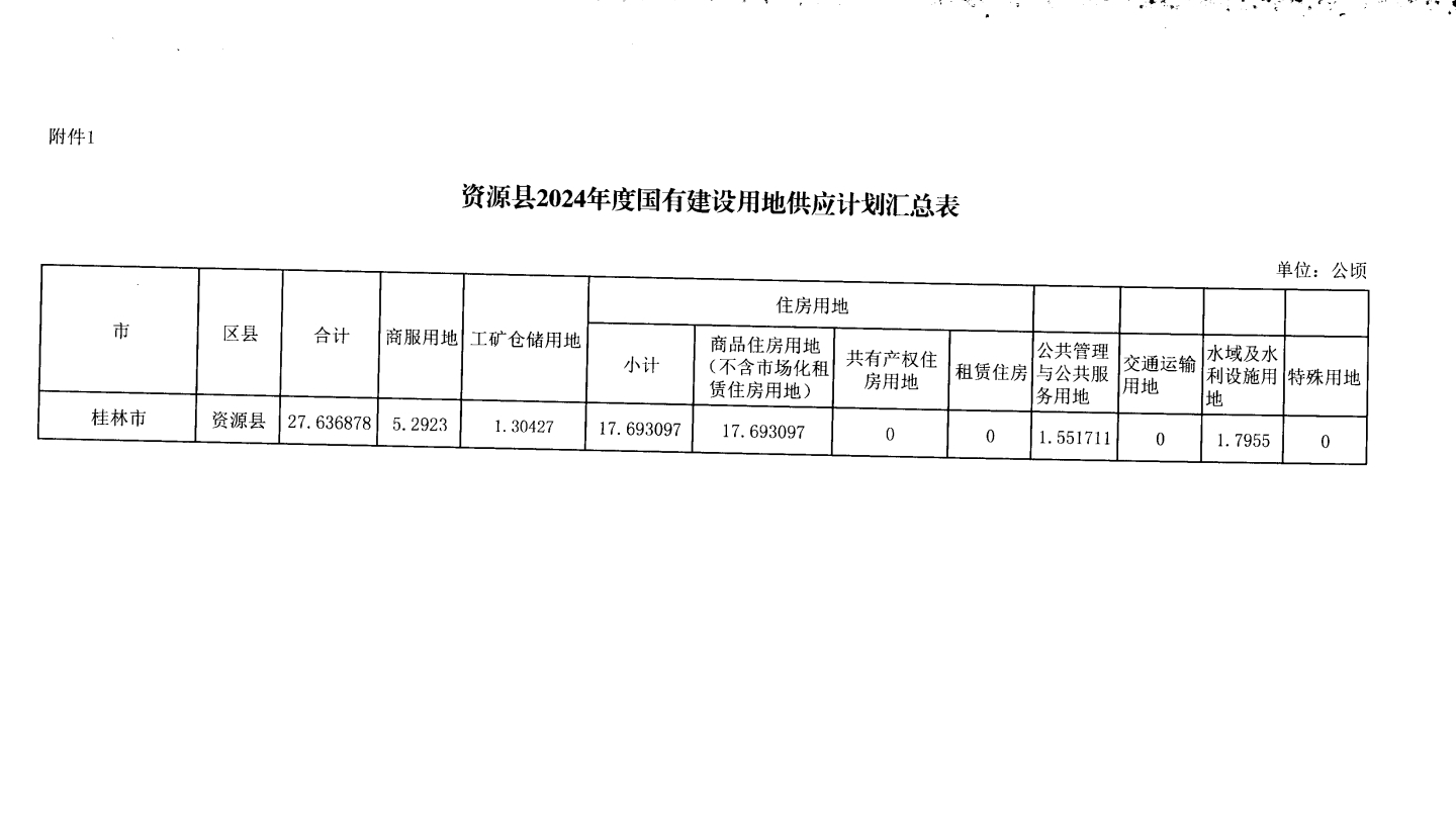资源县2024年国有土地储备供应计划