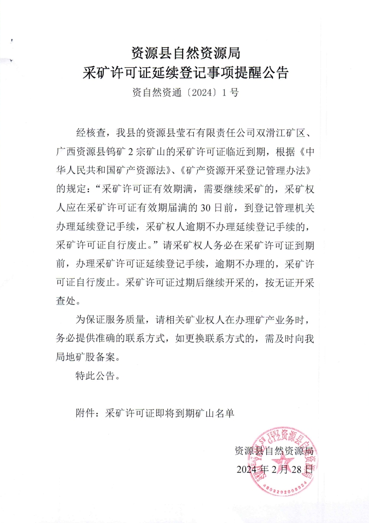 经核查,我县的资源县莹石有限责任公司双滑江矿区、广西资源县钨矿2宗矿山的采矿许可证临近到期,根据《中华人民共和国矿产资源法》、《矿产资源开采登记管理办法》的规定:“采矿许可证有效期满,需要继续采矿的,采矿权人应在采矿许可证有效期届满的30日前,到登记管理机关办理延续登记手续,采矿权人逾期不办理延续登记手续的,采矿许可证自行废止。”请采矿权人务必在采矿许可证到期前,办理采矿许可证延续登记手续,逾期不办理的,采矿许可证自行废止。采矿许可证过期后继续开采的,按无证开采查处。