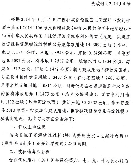 资源县人民政府关于征收2013年第一批次城市建设用地的公告