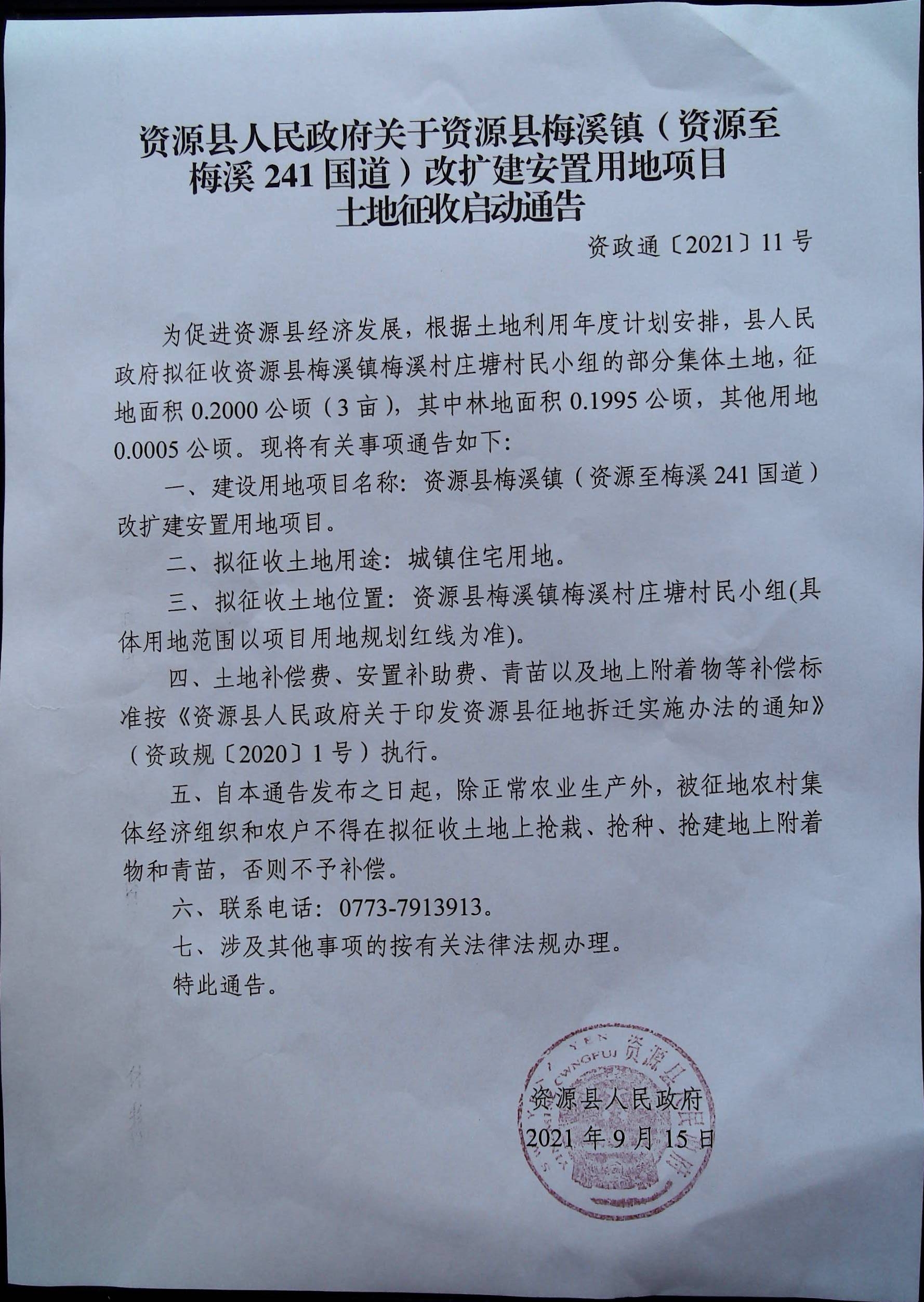 资源县梅溪镇(资源至梅溪241国道)改扩建安置用地项目土地征收启动通告