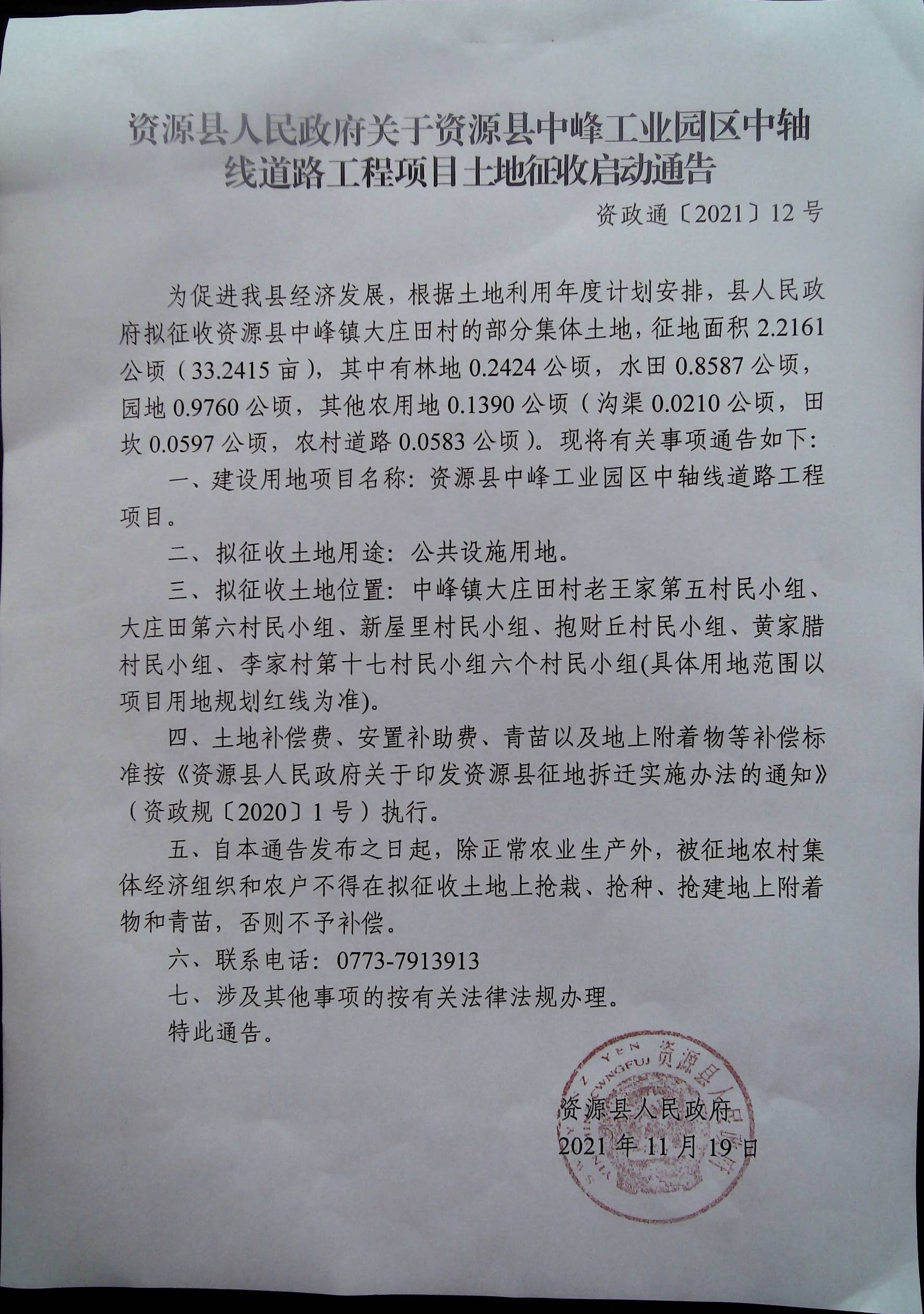 资源县人民政府关于资源县中峰工业园区中轴线道路工程项目土地征收启动公告