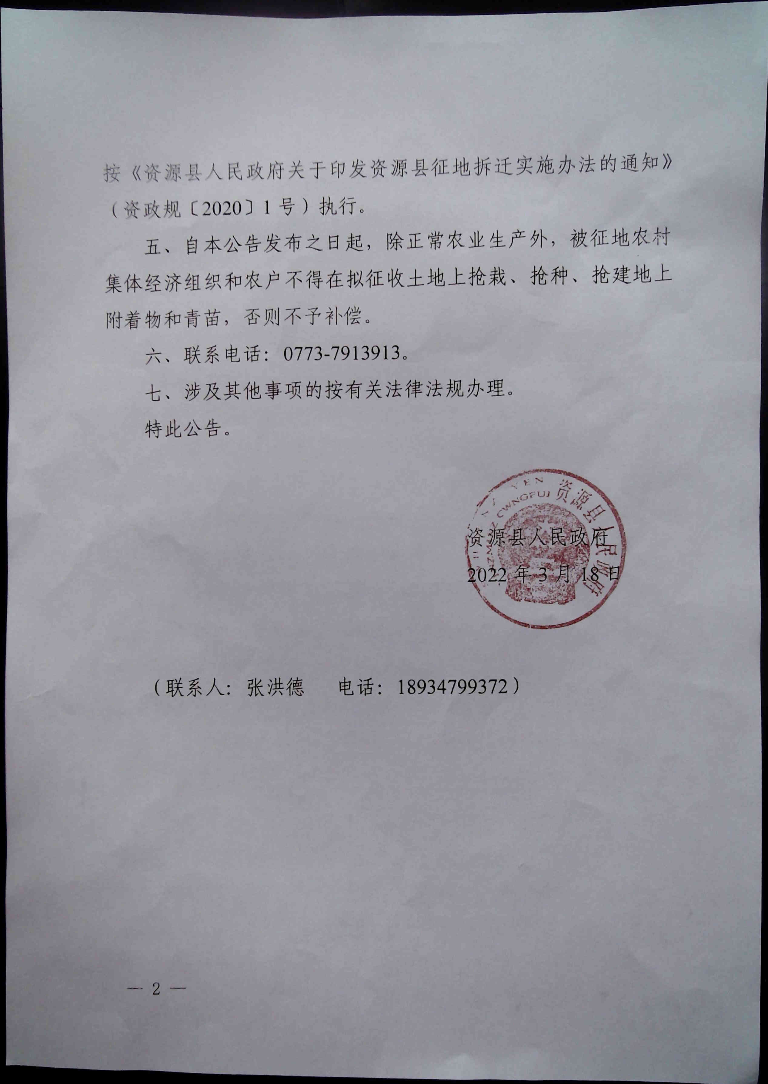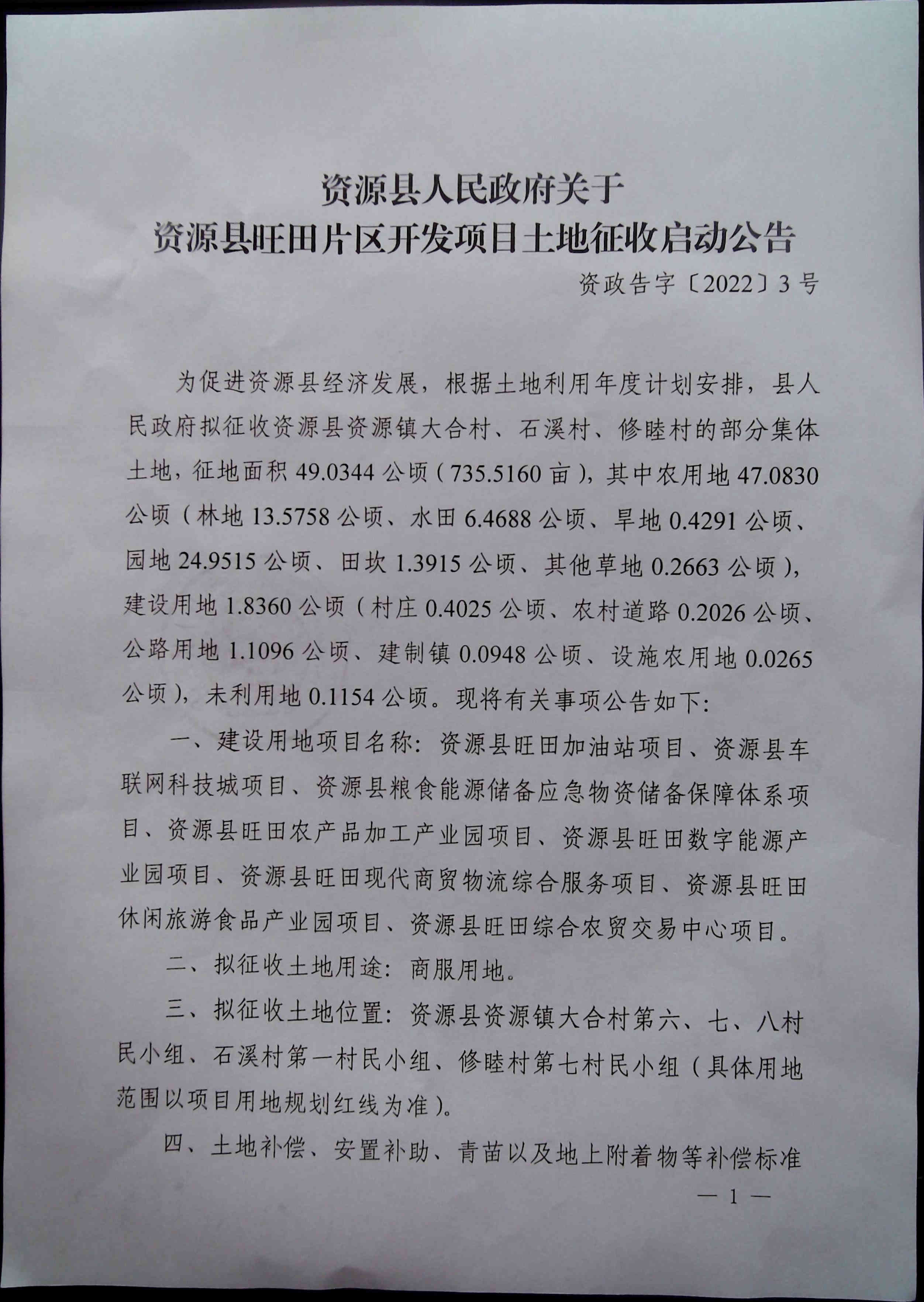 资源县政府关于资源县旺田片区开发项目土地征收启动公告
