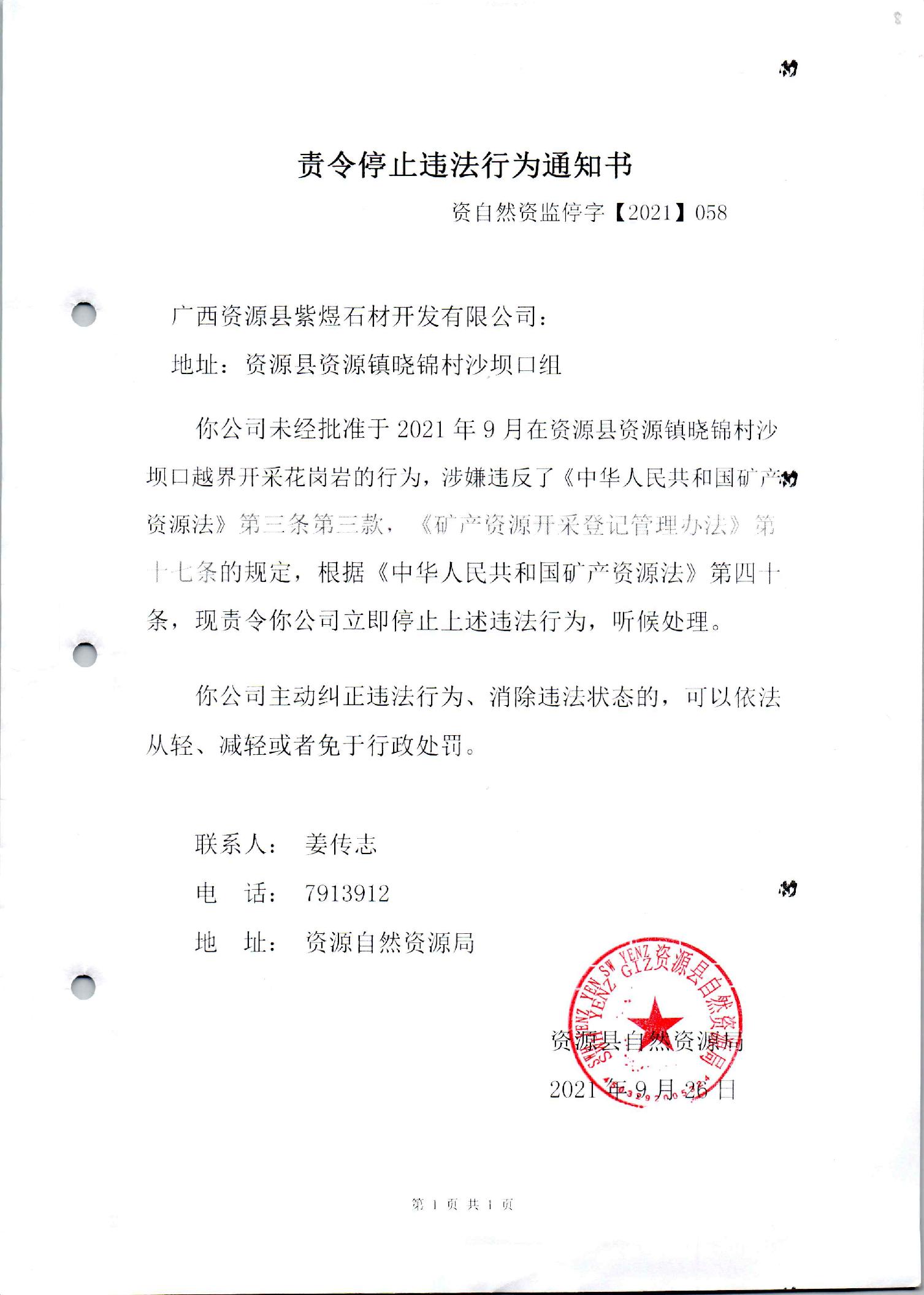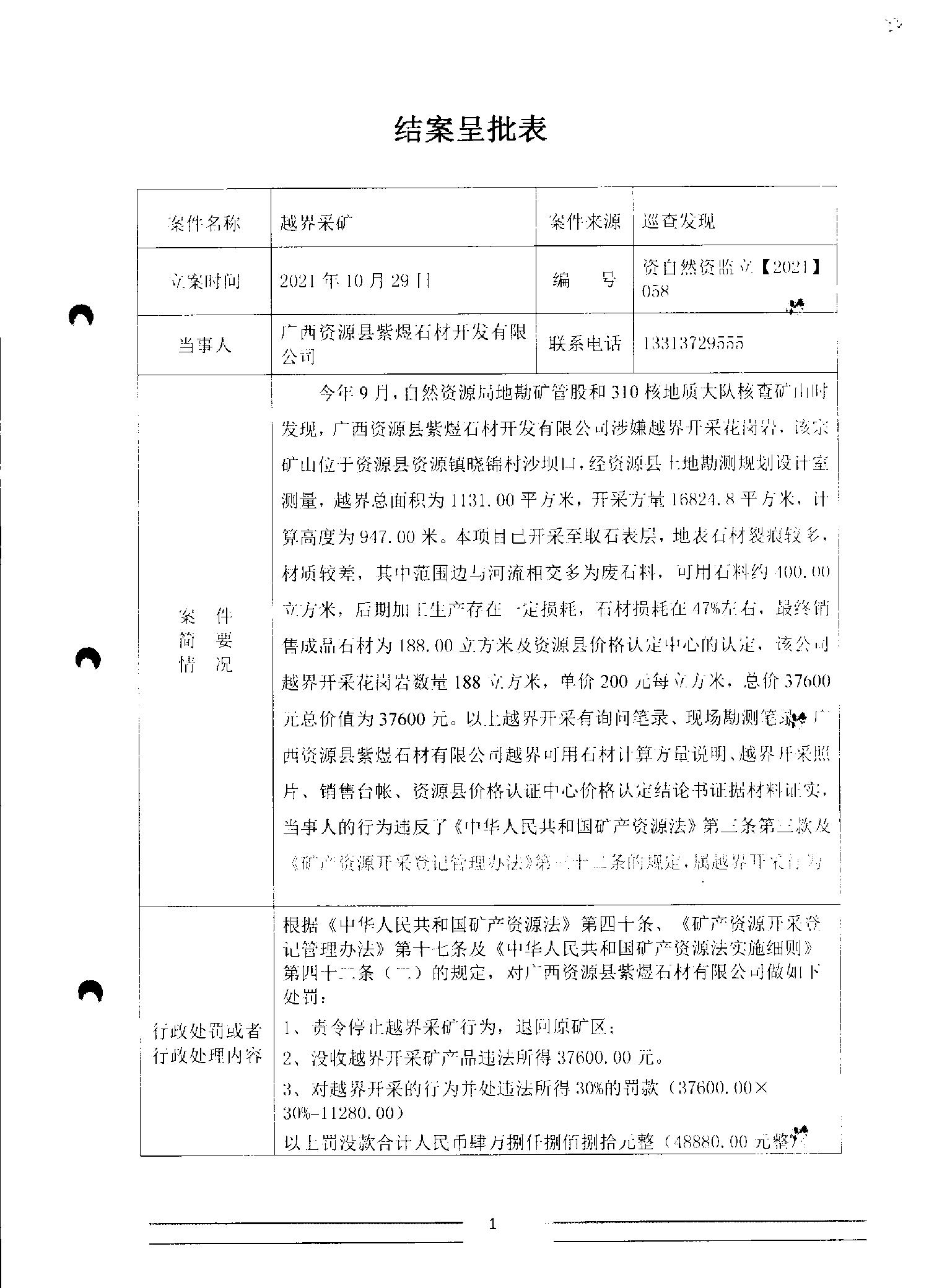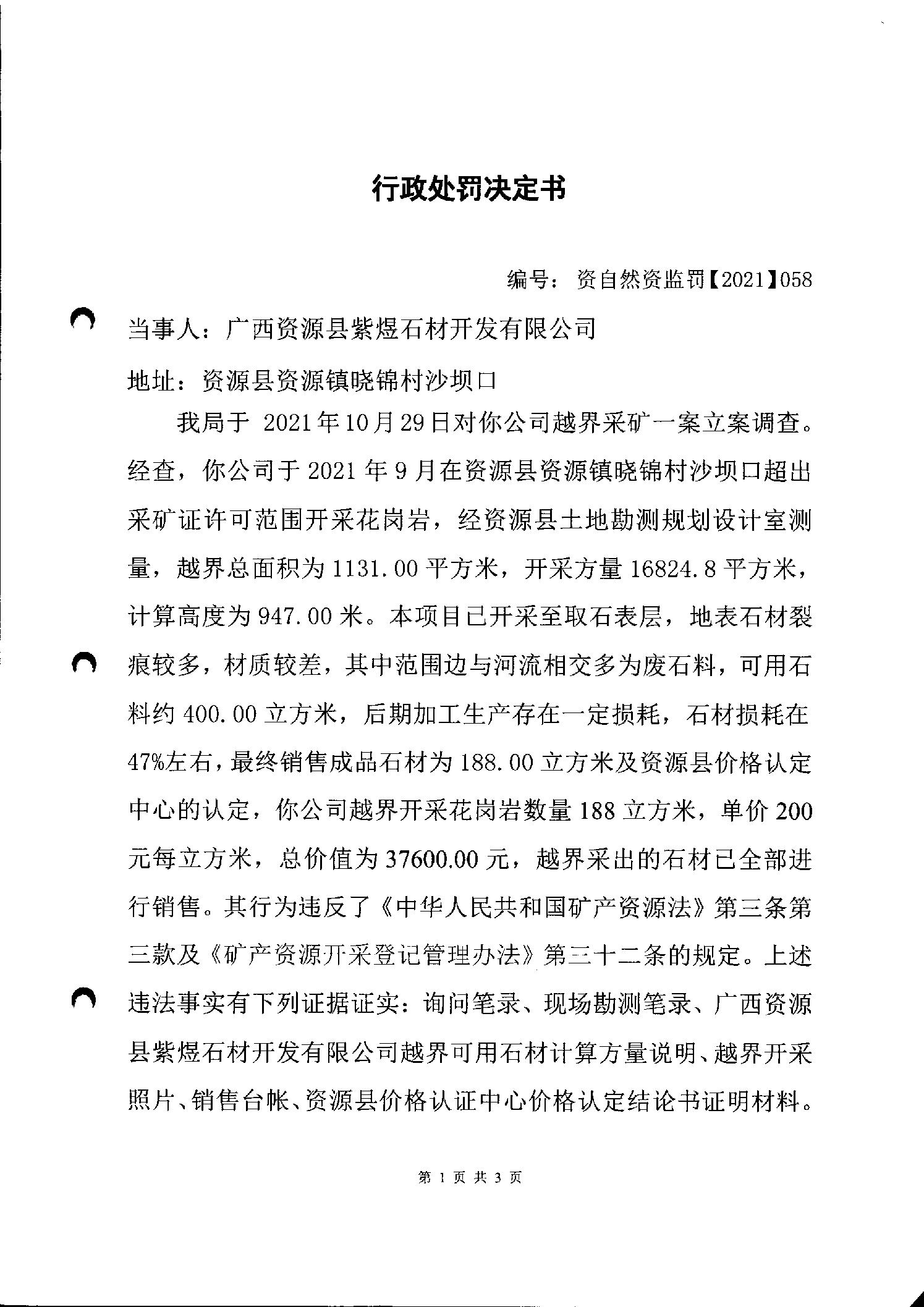 广西资源县紫煜石材开发有限公司行政处罚决定书