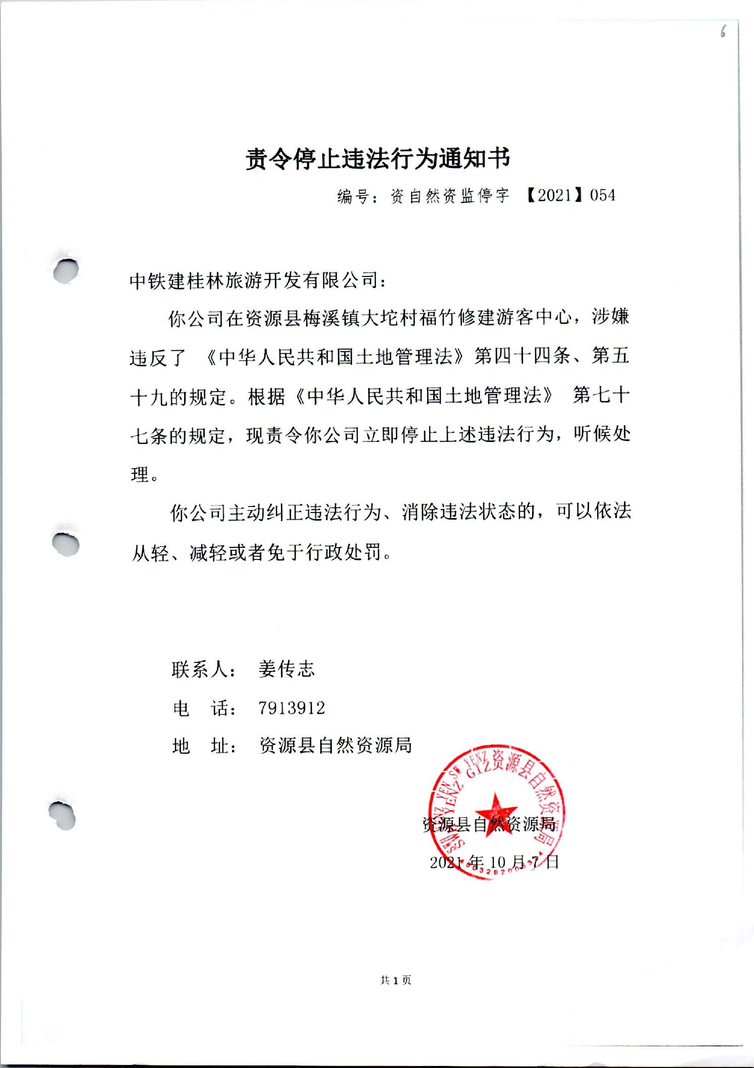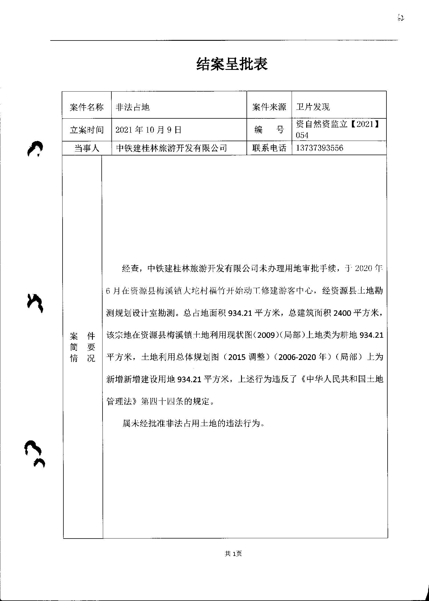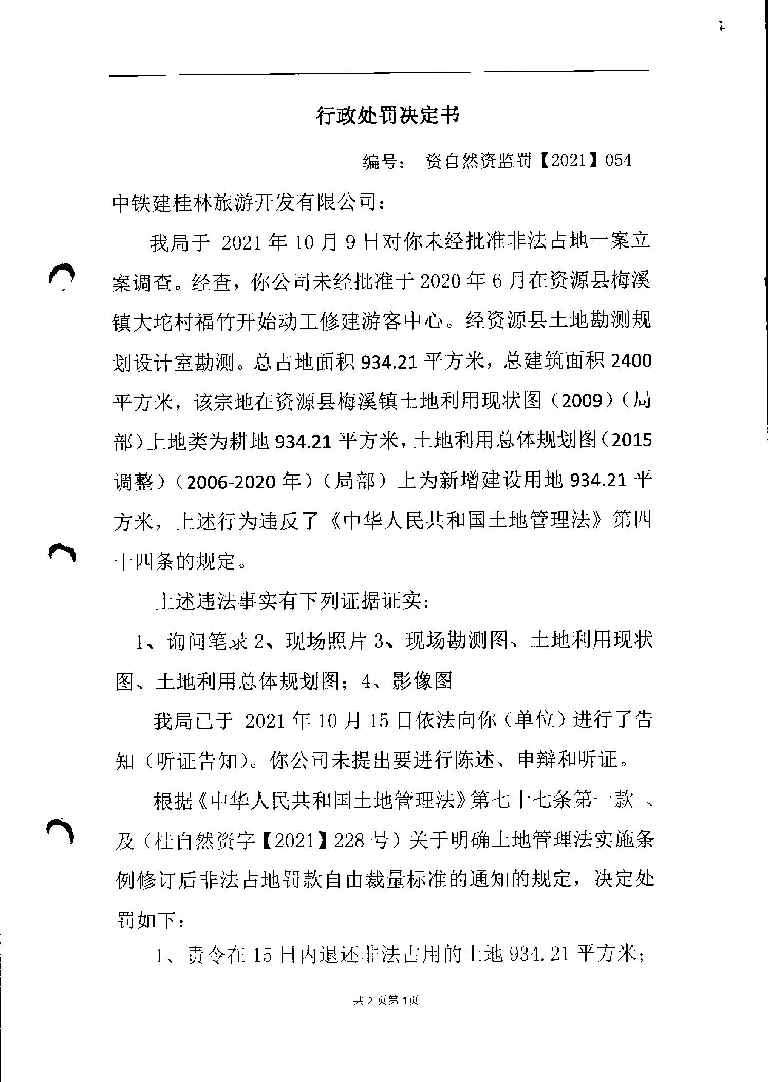 中铁建桂林旅游开发有限公司违法占地修建游客中心行政处罚书