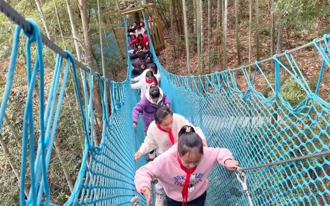 户外实践中,学生们通过滚铁环、投壶、抛绣球等传统游戏,在互动中感受民俗文化的魅力;扎帐篷教学现场,孩子们分组协作,快速掌握户外生存技能;穿越丛林项目将活动氛围推向高潮,大家在安全防护下挑战木桩、钢绳等关卡,在欢声笑语中锻炼勇气与专注力。