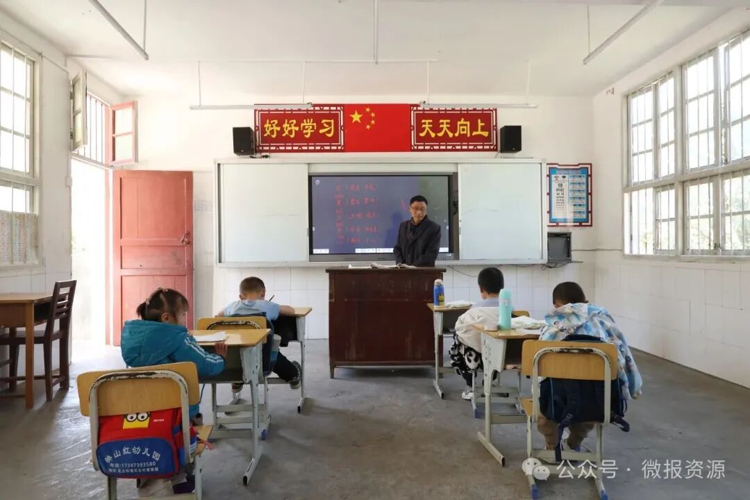 “日月明,田力男。小大尖,小土尘。二人从,三人众。”上午九点,清脆的跟读声从教室传出。曾德干老师站在教学白板前,指着上面的字符和拼音。四个小脑袋齐刷刷地昂着,眼睛紧跟着老师的节奏。教室虽然空旷,但黑板上的板书工整清晰,墙上的识字贴画色彩鲜艳,一切都井然有序。