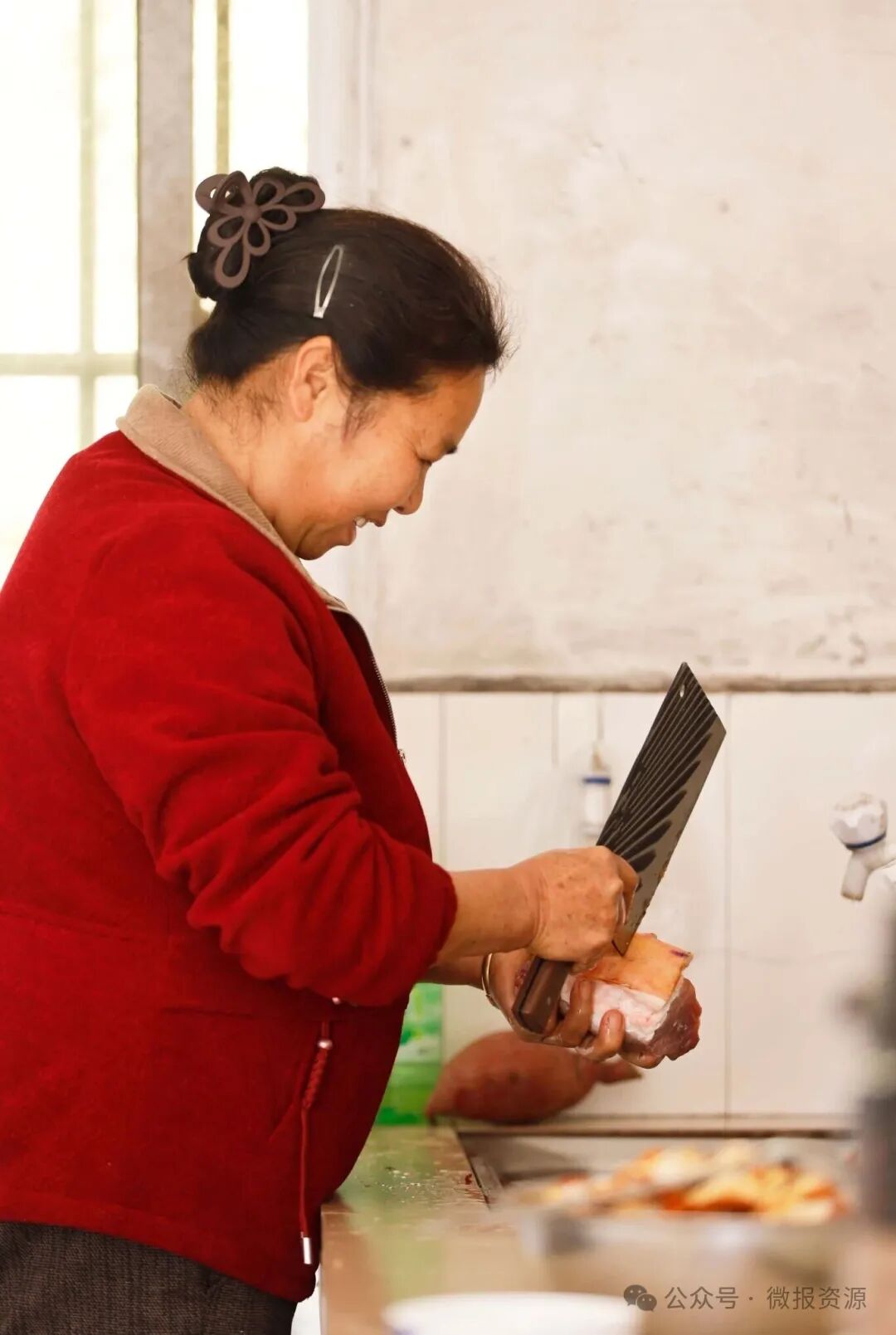 临近中午,阵阵茶香、饭香逐渐飘来,学校的中心从教室转移到了厨房。这里,是刘六清的“主场”,她麻利地洗刷着青菜,水珠在碧绿的叶子上滚动,案板上,一块五花肉已被切成均匀的小块。