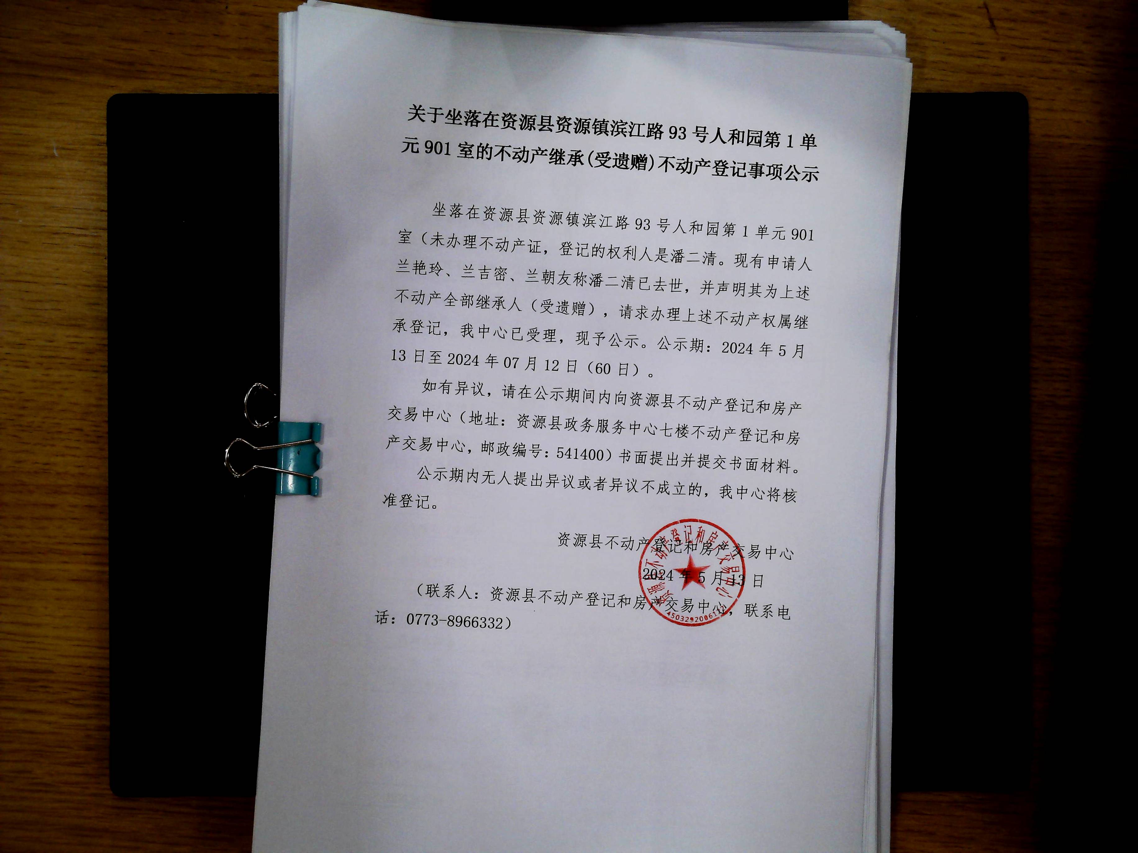 关于坐落在资源县资源镇滨江路93号人和园第1单元901室的不动产继承(受遗赠)不动产登记事项公示