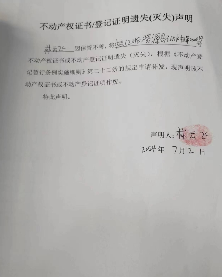 关于林云飞不动产权证书或登记证明遗失(灭失)声明