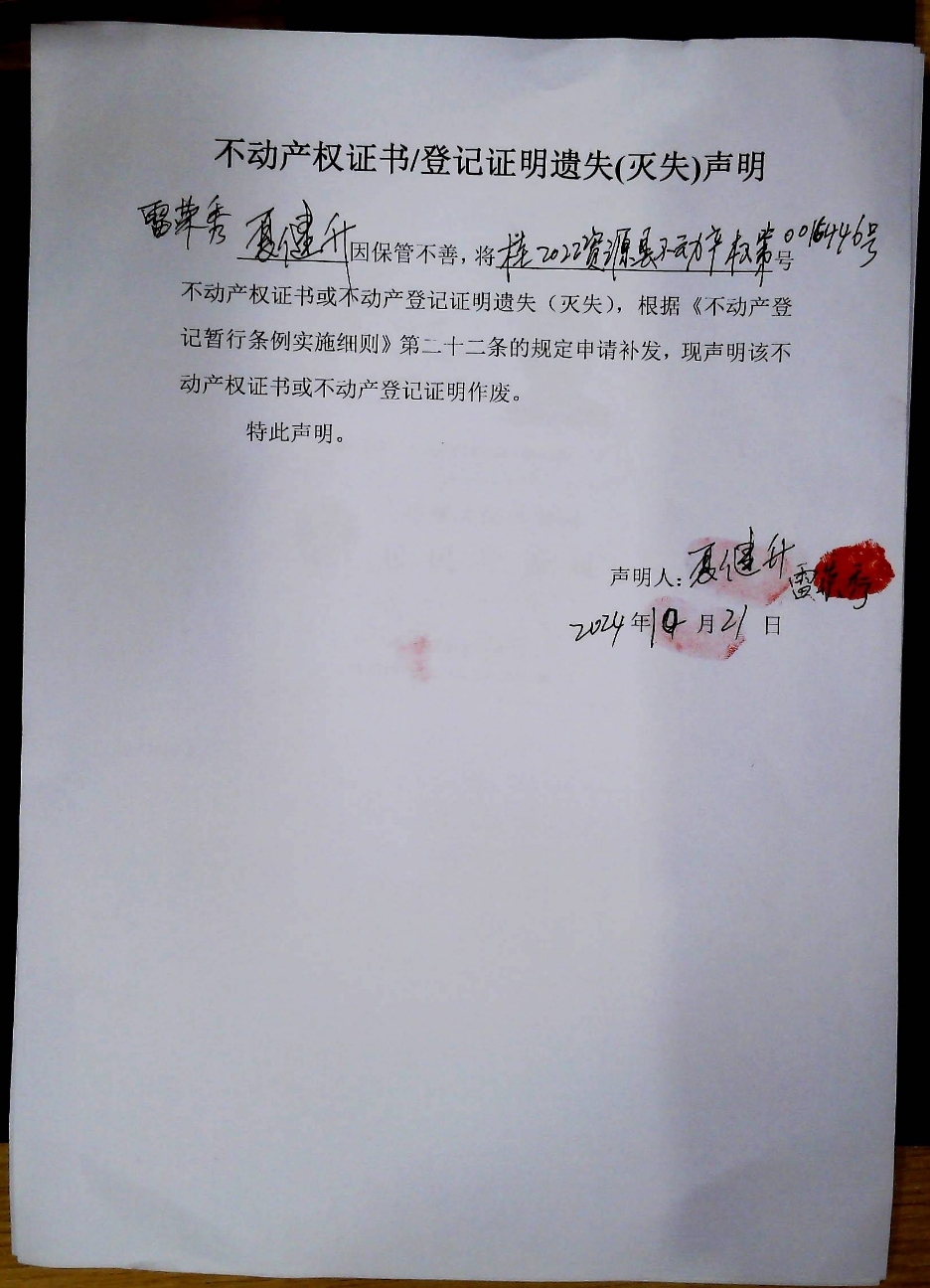 关于雷荣秀、夏健升不动产权证书或登记证明遗失(灭失)声明