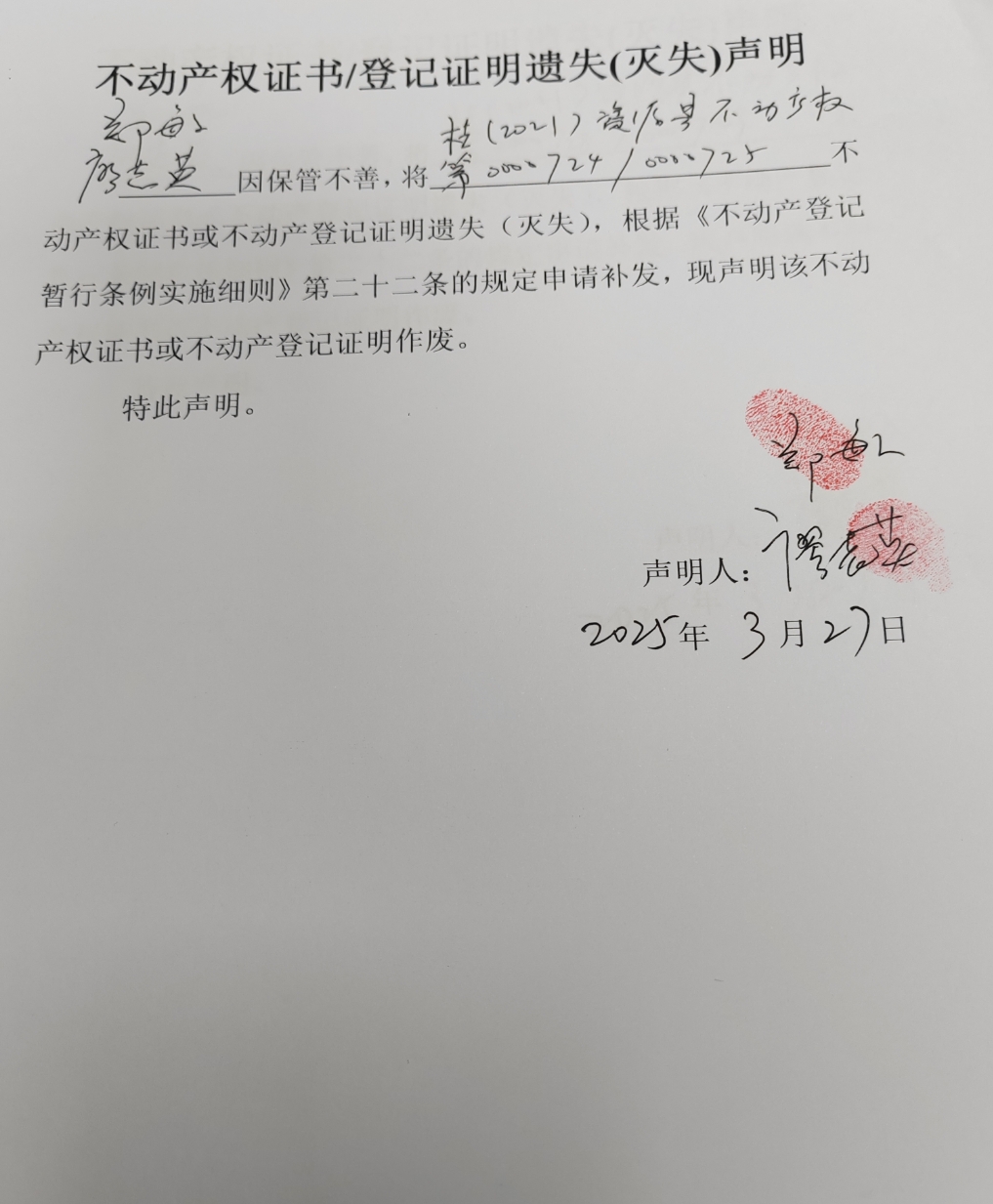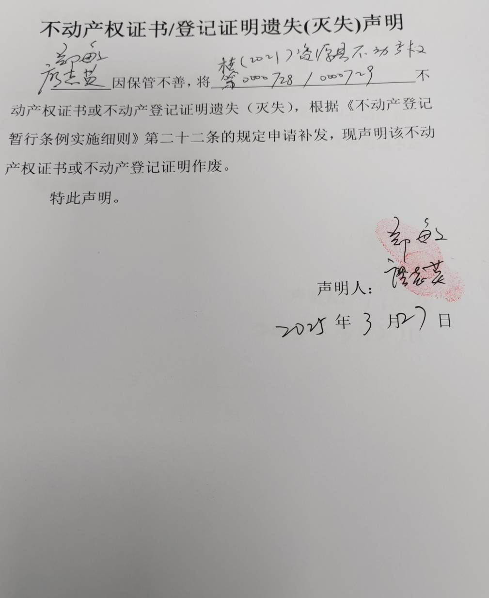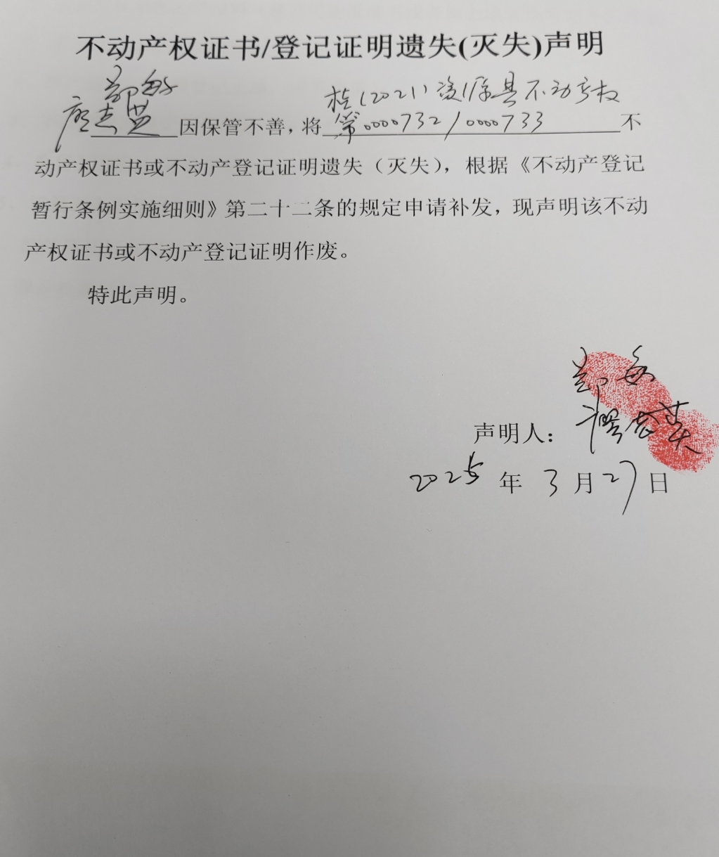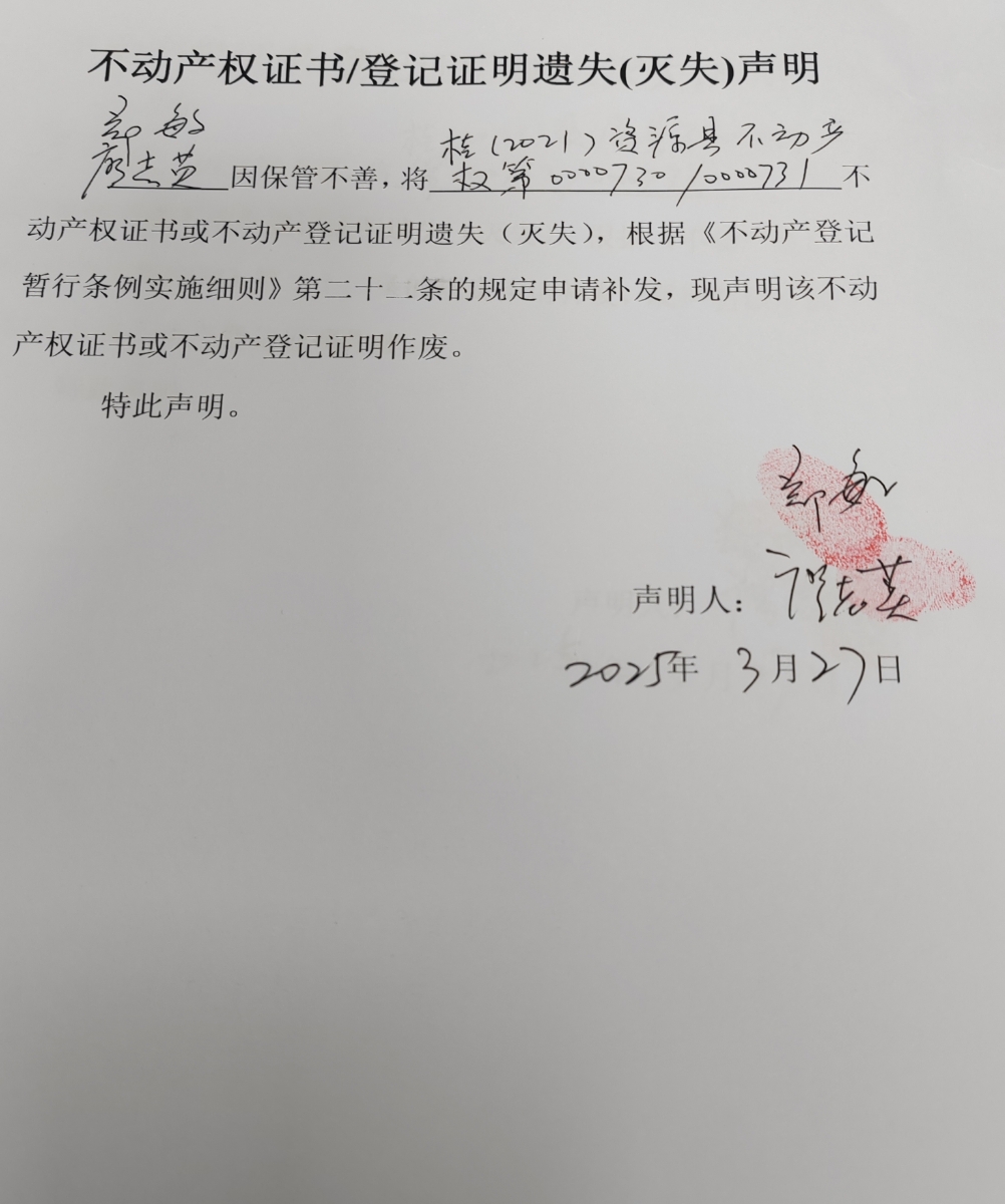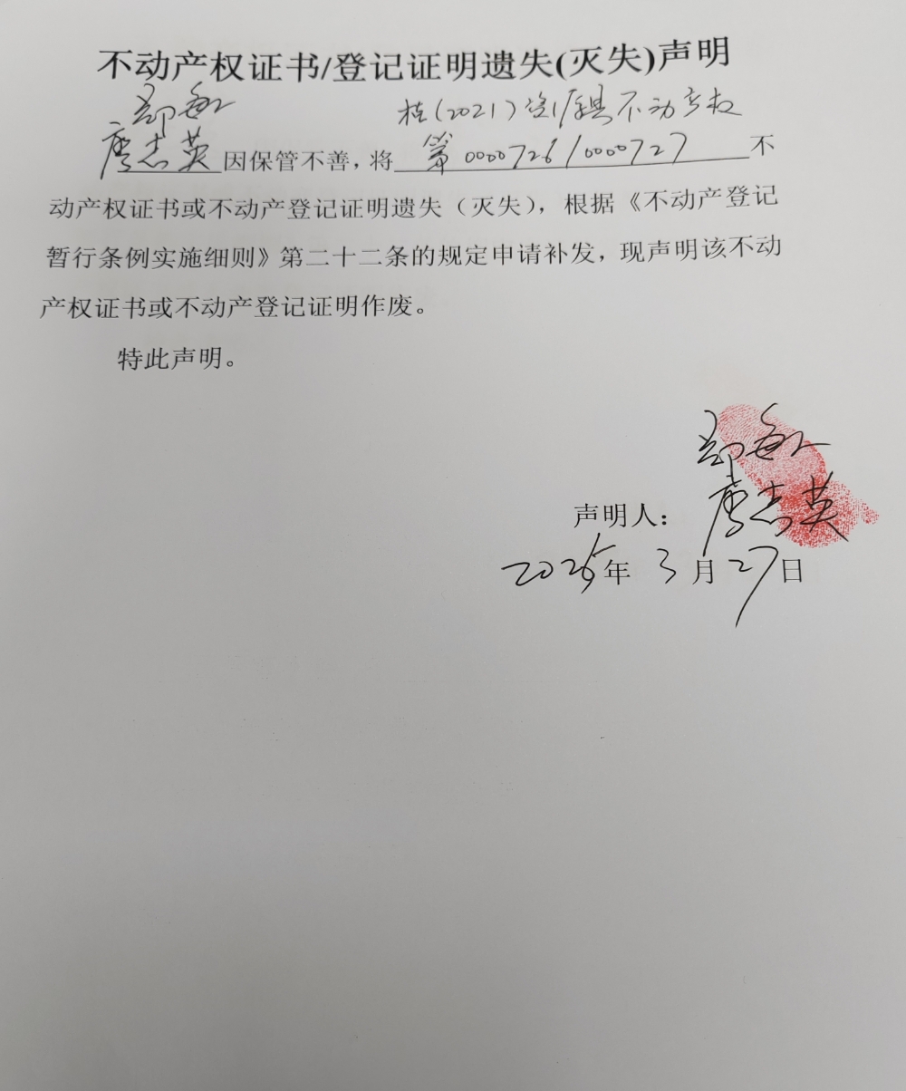 关于廖志英、郑敏不动产权证书或登记证明遗失(灭失)声明