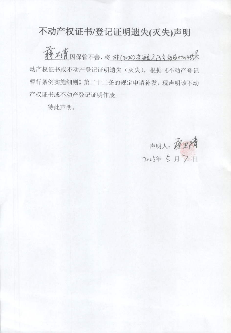 关于蒋卫清不动产权证书或登记证明遗失(灭失)声明
