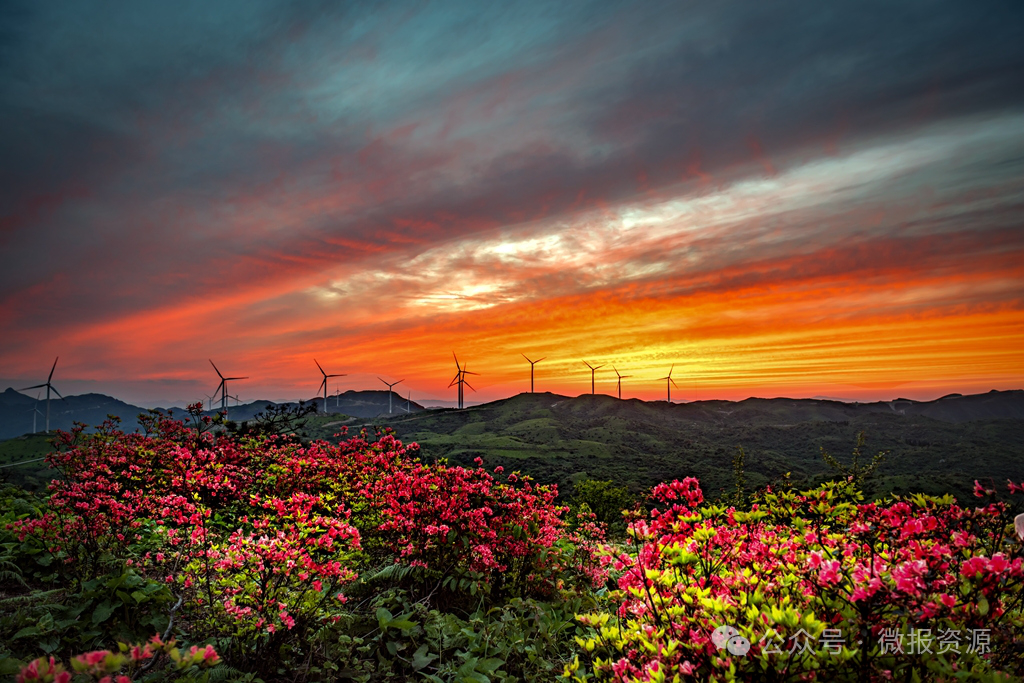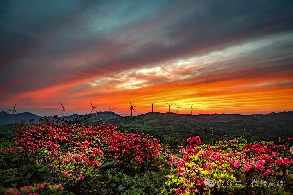 在这里,游客不仅能近距离地感受风能发电机的壮丽场面,还能欣赏到漫山遍野的艳丽杜鹃花。高海拔地区的杜鹃花开放时间长,放眼望去,漫山遍野的杜鹃花争芳斗艳,点染群山林海,编织成一幅以杜鹃花为主色调的天然画卷。