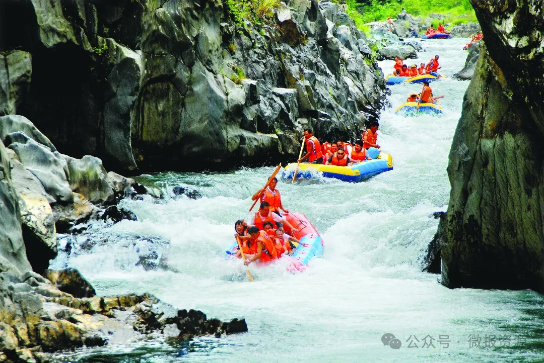 夏天雨水充沛,浪花满河。一艘艘漂流艇在时而湍急、时而平缓的水流中顺流而下,两岸的丛林郁郁葱葱,翻腾的浪花、湍急的险滩带来阵阵欢呼,游客在青山绿水间体验着一场秀美山水与漂流竞渡的激情碰撞。