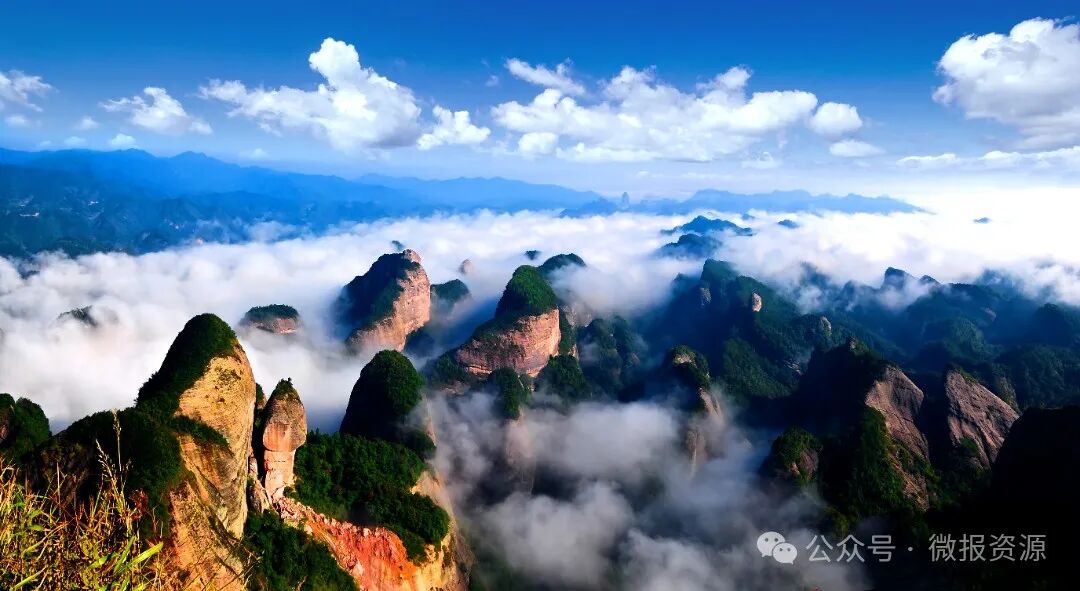 历经千万年的地质演变,发育丰富程度和品位世界罕见,境内上百座簇群式的丹霞峰丛林,峭拔挺立,雄险神奇,与山间气象万千的朝霞、云海、佛光交汇成一幅丰富绚丽的地质画卷。