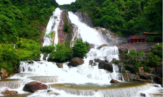宝鼎瀑布距县城12公里,面积15平方公里,主要由宝鼎瀑布、宝鼎湖、宝鼎山、白云庵、原始矮林等几部分组成。宝鼎瀑布发源于华南第二高峰真宝鼎。它象一条银色巨龙穿云破雾,从天而降,其宏伟气势,可谓“飞流直下三千尺,疑是银河落九天”。瀑布水流量大,落差近700米。从瀑顶到瀑底,几经周折,形成九级直落宝鼎湖。明代旅行家徐霞客赞之曰:“悬崖飞瀑,长如布、转如倾、匀成帘”。宝鼎瀑布气势磅礴、造型优美、瀑色绚丽、瀑声音韵别致。宝鼎湖面积为705亩,最深50米,平均深度35米,犹如一面大明镜镶嵌在群山之中,泛舟其上,湖光山色,尽入眼帘,令人心旷神怡,流连忘返。目前开放了空中自行车、旋转的四季之环(360自行车)、测试肺活量的喊泉、水上摩托艇等项目。