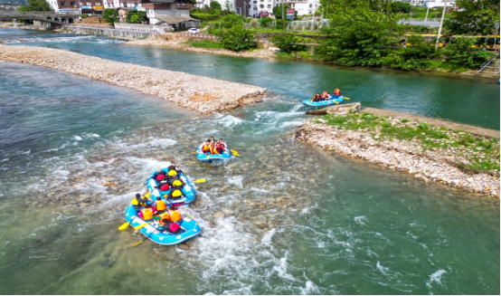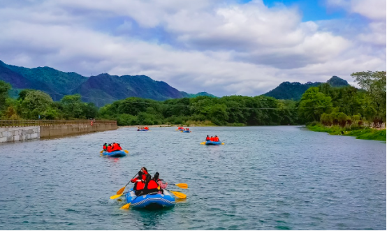 中峰漂流位于资源县中峰镇,距县城12公里,是红军长征曾经到过的地方,漂流全程长约5公里,游程约90分钟,是一项自助型休闲娱乐亲水的皮筏艇漂流活动。中峰漂流的河段处于资江源头,河水清澈,沿途小鱼、水草、沙石清晰可见,两岸绿树成荫。它融于乡村山水田园风光中,沿途有万亩红提、红心猕猴桃、草莓、蓝莓等采摘园、半边街民宿村落、大沙洲四星级农家乐、抱财丘和老王家新农村、低空旅游航站、油榨坪公堂、资源县党员群众初心教育馆、红军廊道等丰富的各种旅游资源。五公里长的骑行绿道像一条红色绸带围绕在悠悠资江岸边,与漂流航道相得益彰。是一处集生态、农业、文化等旅游资源于一身的绝佳亲水漂流地。