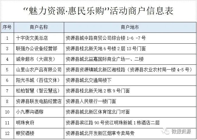 资源县“魅力资源 惠民乐购”第三期促销活动火热来袭!活动在县大型商超、百货零售、餐饮行业中举行,前所未有的优惠力度(300减80、100减25),消费券数量有限,先到先得。