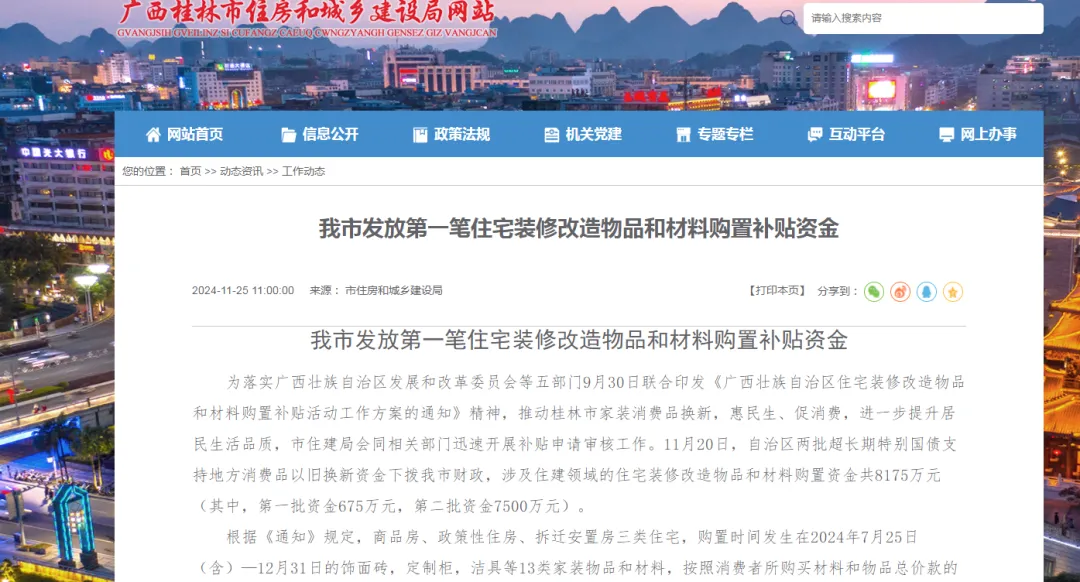 11月20日,自治区两批超长期特别国债支持地方消费品以旧换新资金下拨我市财政,涉及住建领域的住宅装修改造物品和材料购置资金共8175万元。其中,第一批资金675万元,第二批资金7500万元。11月22日,阳朔县已成功发放了第一笔补贴。