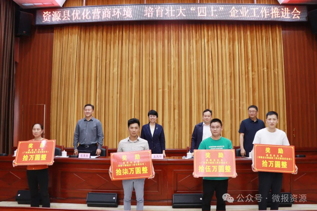 会上,王凤玲等县领导为资源县2022年新增“四上”企业与资源县2022年符合营收、产值增幅奖励的在库企业颁奖;桂林宇鹏建设工程有限公司、资源县小食侯湘餐饮店、资源山里山农产品有限公司等优秀企业代表依次作交流发言,分享经验。