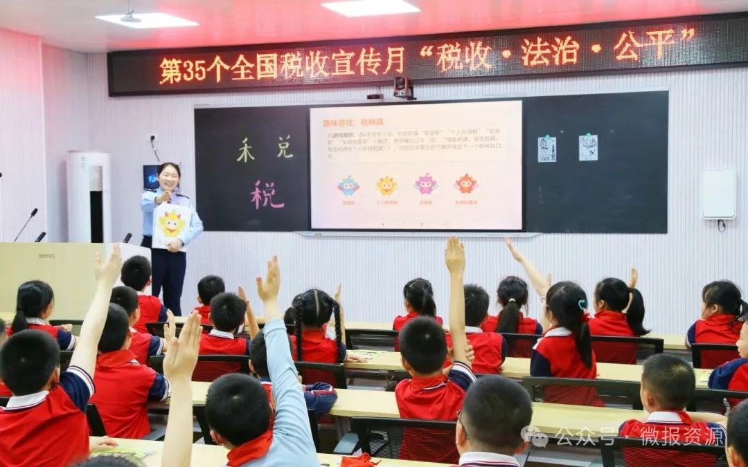 活动伊始,副校长陈桂平上台致辞,向同学们普及依法纳税的重要意义,鼓励大家主动学习税法知识,争做守法小公民。随后,资源县税务局干部围绕“税收取之于民、用之于民”展开讲解,结合校园建设、交通出行、医疗保障等身边实例,生动阐释税收与日常生活的紧密联系,让同学们明白税收是国家发展、民生改善的重要保障。现场还设置了“税种蹲”趣味互动游戏,小朋友们踊跃参与,在轻松欢乐的氛围中认识了各类税种,同时化身“小小税法宣传员”,立志把学到的税法知识带回家、讲给家人听。