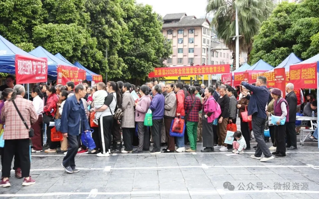 4月15日,在第11个全民国家安全教育日当天,资源县在县中心花园广场开展2026年全民国家安全教育日集中宣传活动。活动由中共资源县委员会国家安全委员会牵头,资源镇、团县委、县司法局及县委国安办各成员单位共同协办,以“统筹发展和安全 护航‘十五五’新征程”为主题,面向群众开展国家安全普法宣传。