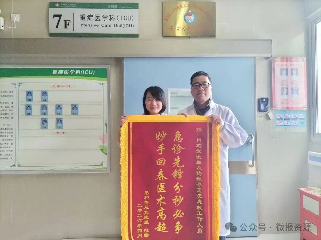 近日,资源县人民医院重症医学科收到了一份跨越治疗全程的温暖谢意——曾因急性大面积肺栓塞两次心跳骤停、命悬一线的患者易女士,在康复出院后,特意委托女儿专程回到科室,向全程主导抢救的肖慈武副主任医师及全体医护团队送上感谢,用最真挚的方式,致敬这场与死神竞速的生命守护战。