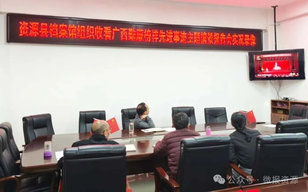 近日,资源县档案馆组织全体党员干部在馆二楼会议室集中收看广西勤廉榜样先进事迹主题情景报告会实况录像。