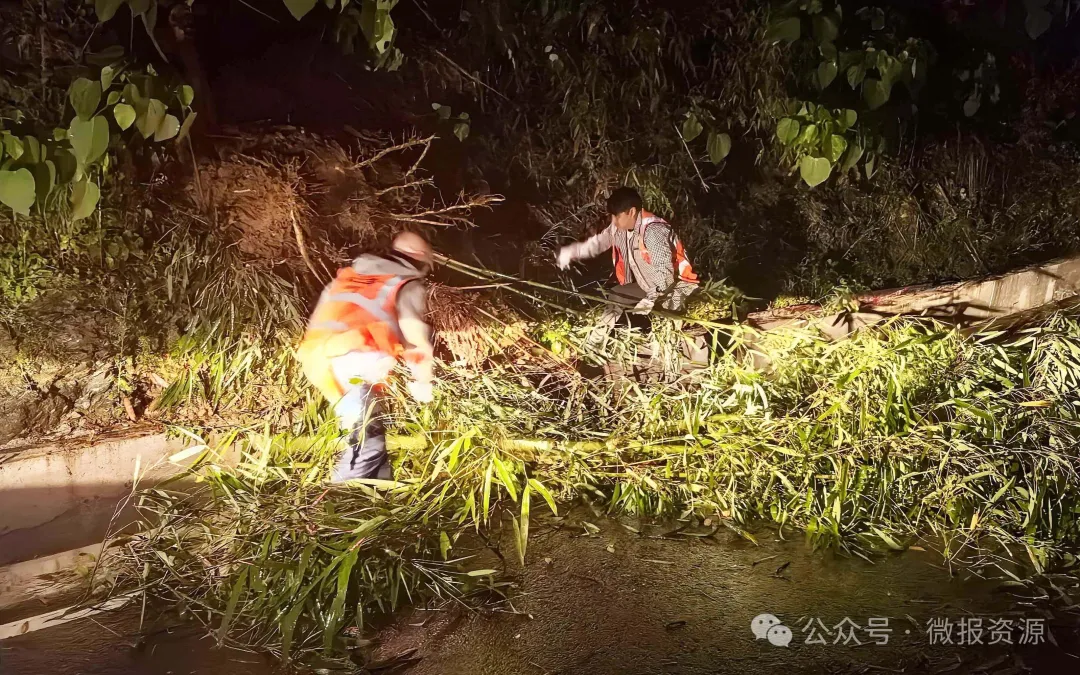 ▲资源公路养护中心在国道241线资源县梅溪镇路段清理路面落石及倒伏路树